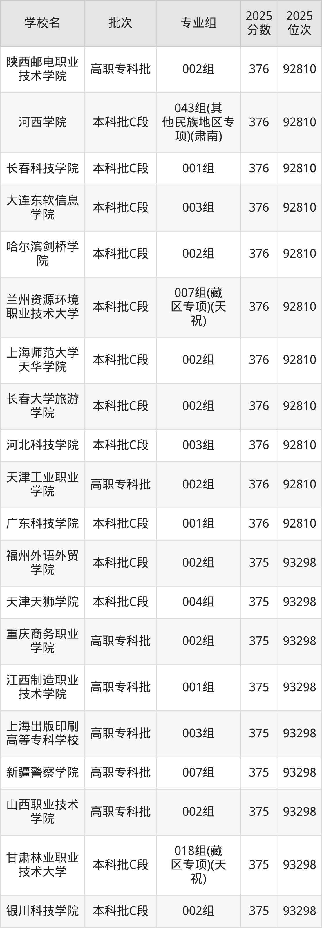 2025年甘肃高考物理类376分(92362名~92810名)能上的大学有河北科技学院003组、大连东软信息学院003组、长春科技学院001组、吉林师范大学博达学院003组等。