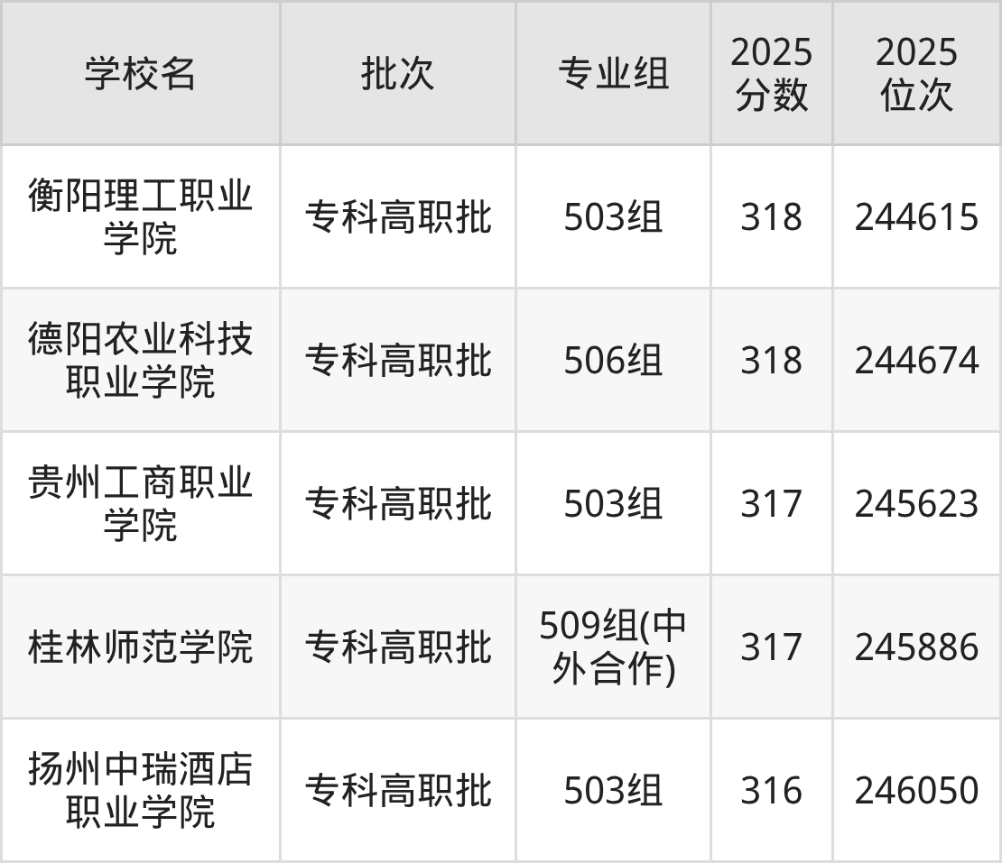2025年广东高考历史类317分(245106名~245884名)能上的大学有桂林师范学院509组(中外合作)、贵州工商职业学院503组。