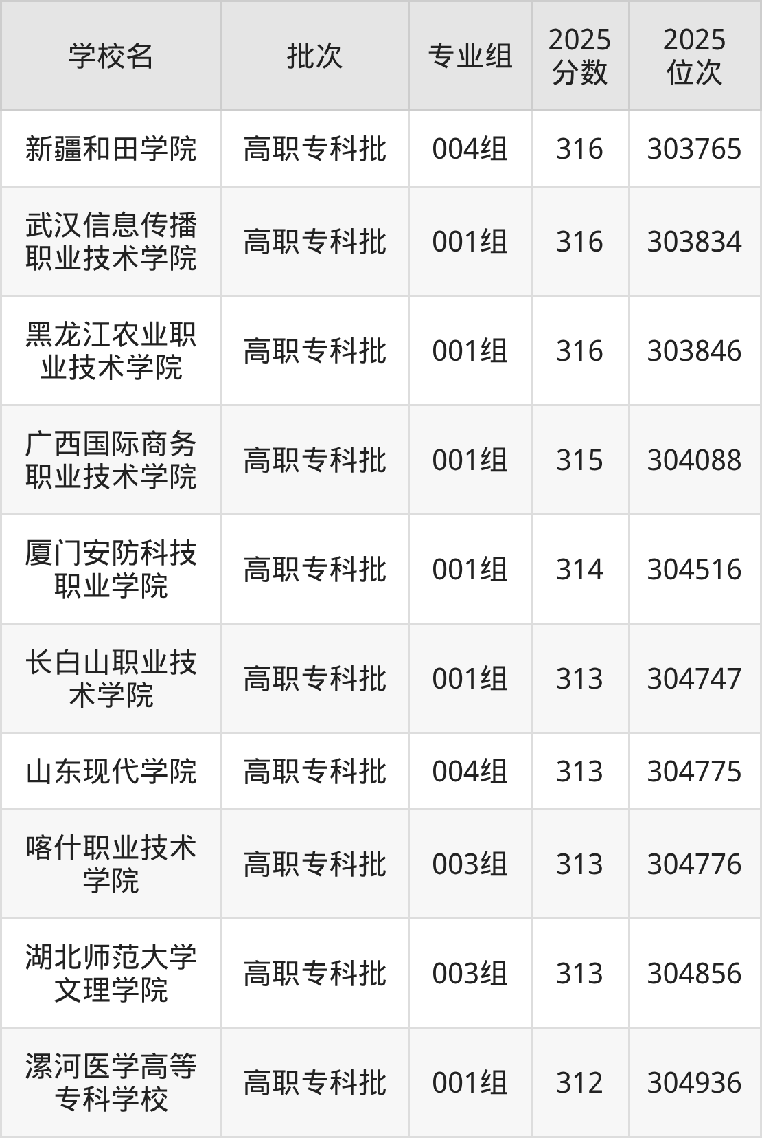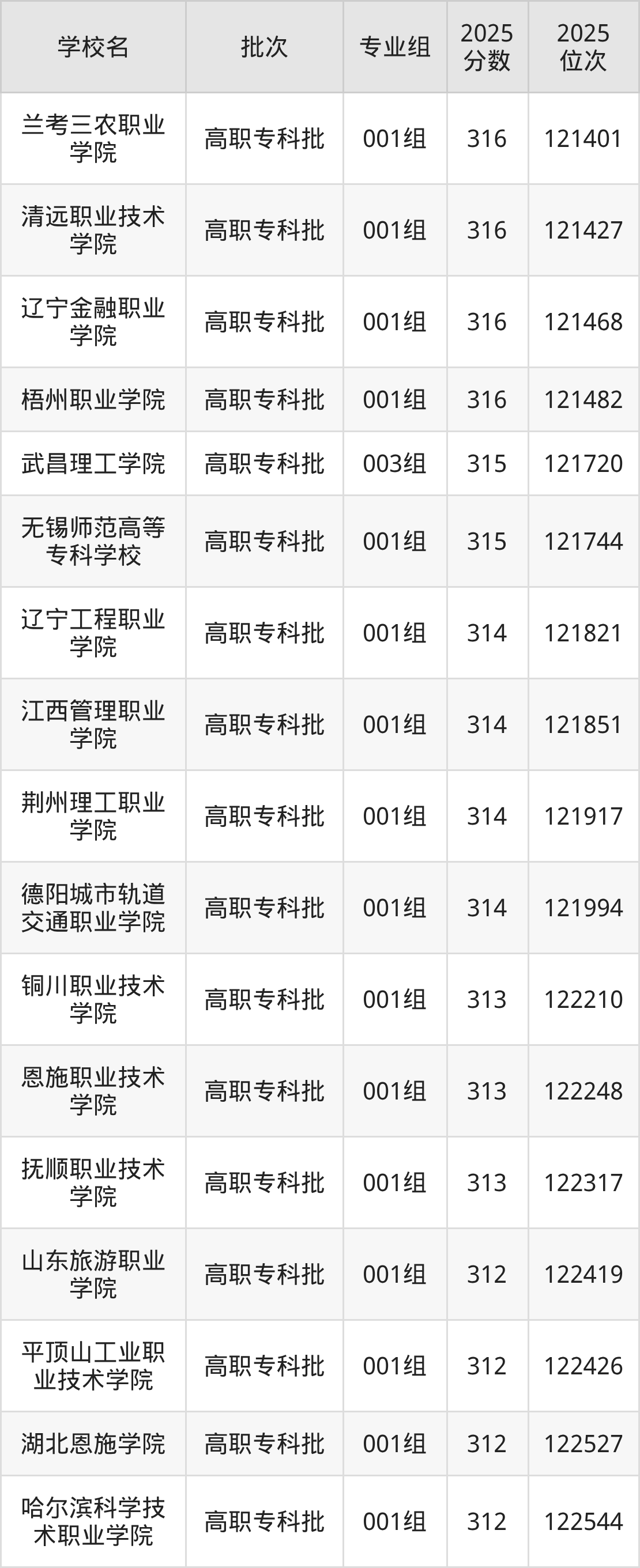 2025年安徽高考历史类314分(121793名~122088名)能上的大学有德阳城市轨道交通职业学院001组、江西管理职业学院001组、荆州理工职业学院001组、辽宁工程职业学院001组。
