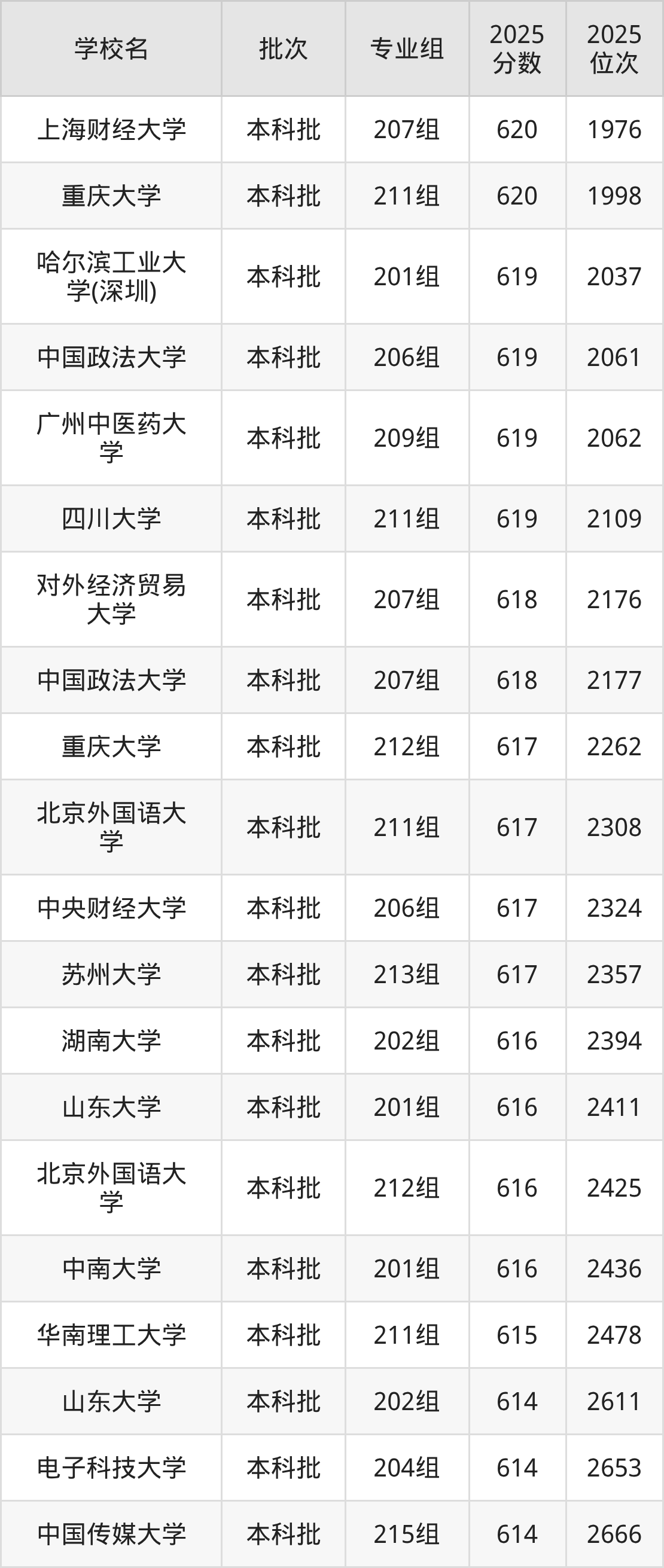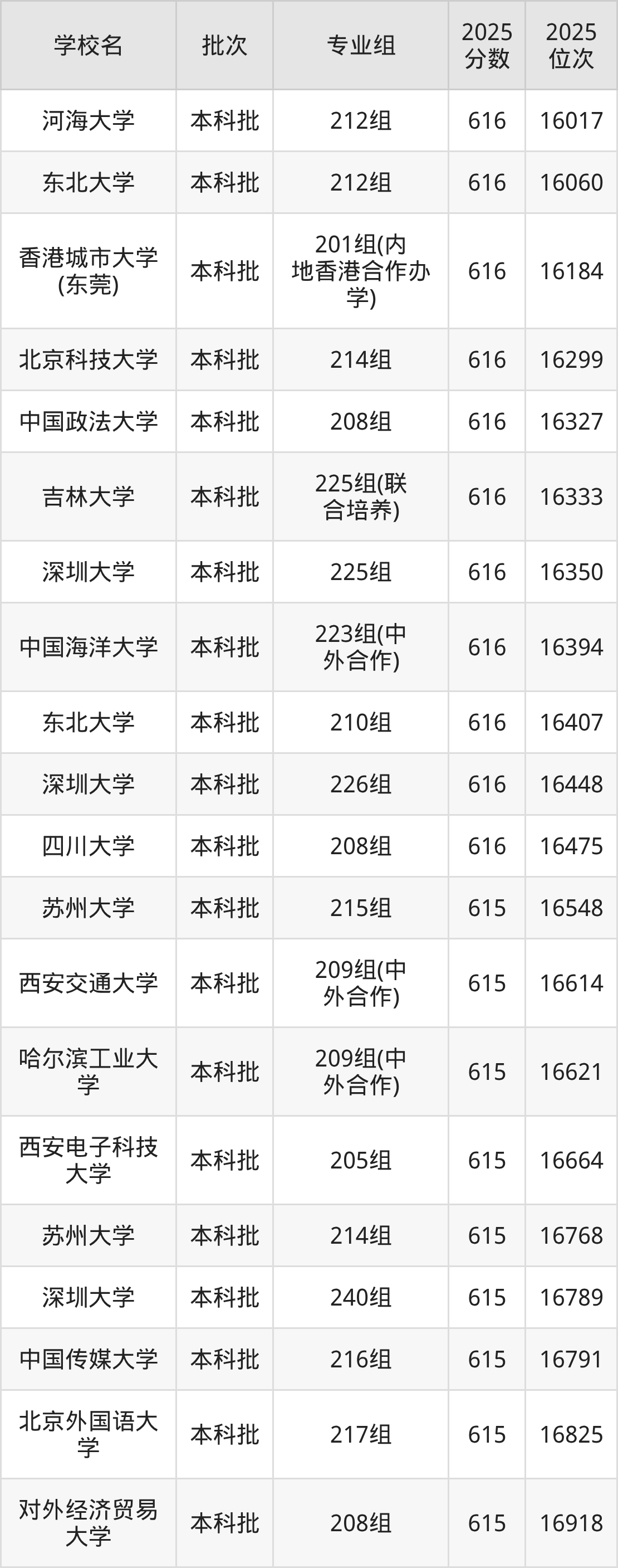 2025年广东高考物理类615分(16494名~17051名)能上的大学有北京外国语大学217组、中国传媒大学216组、对外经济贸易大学208组、哈尔滨工业大学209组(中外合作)等。