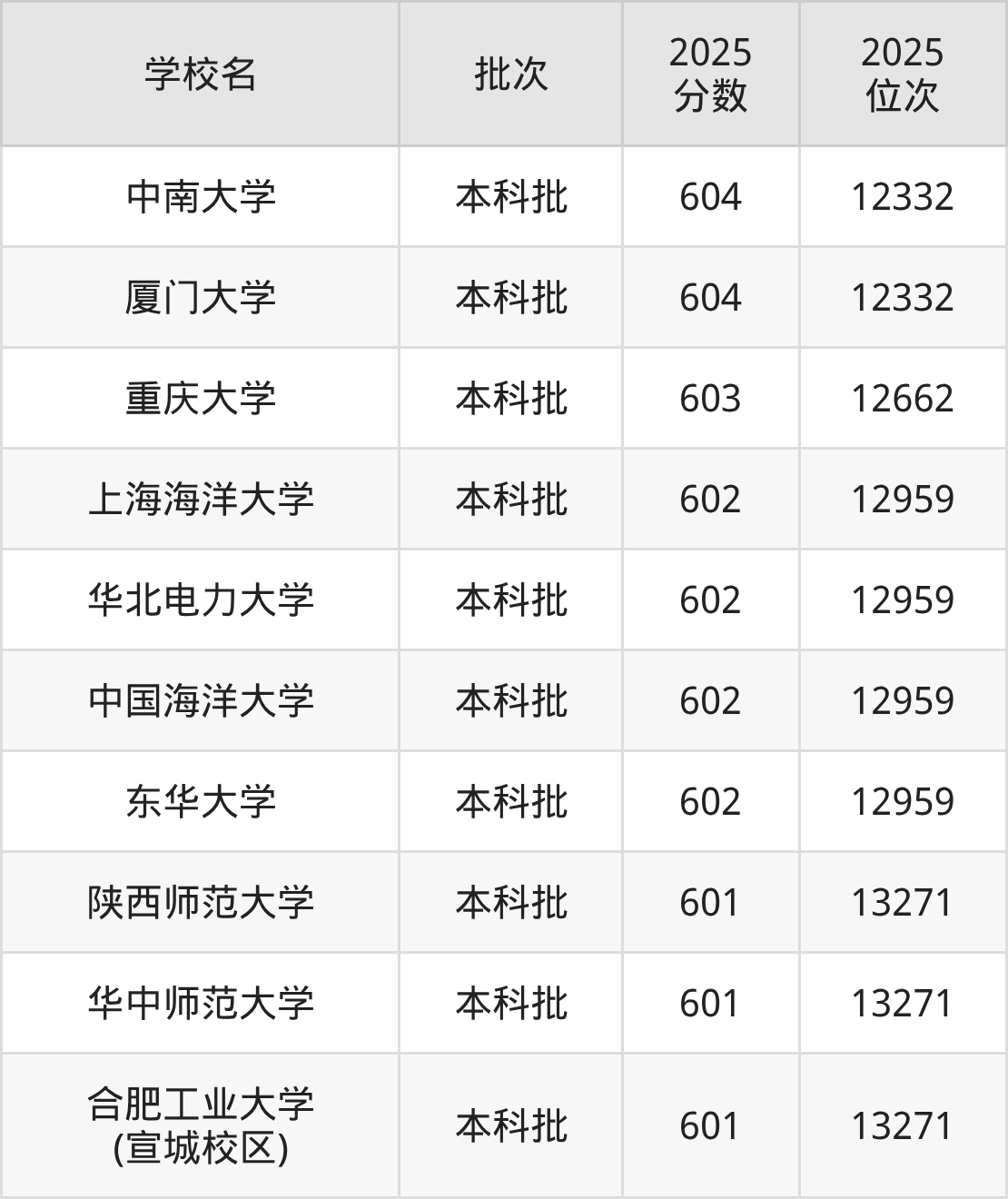 另外录取位次低于该区间(较稳妥)的有华中师范大学(13271名)、合肥工业大学(宣城校区)(13271名)等;录取位次高于该区间(可冲)的有重庆大学(12662名)、厦门大学(12332名)等。