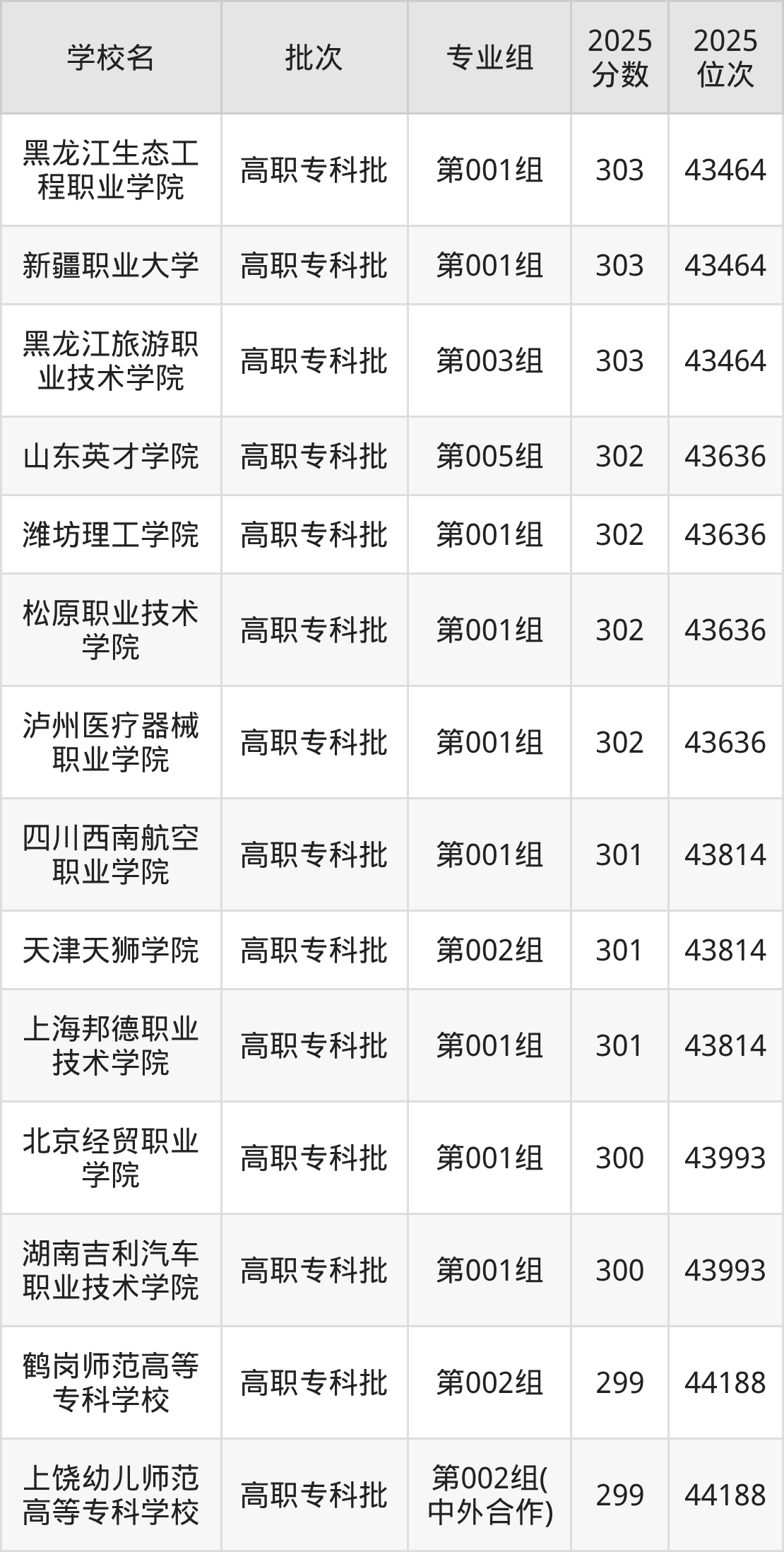 2025年黑龙江高考历史类300分(43815名~43993名)能上的大学有北京经贸职业学院第001组、湖南吉利汽车职业技术学院第001组。