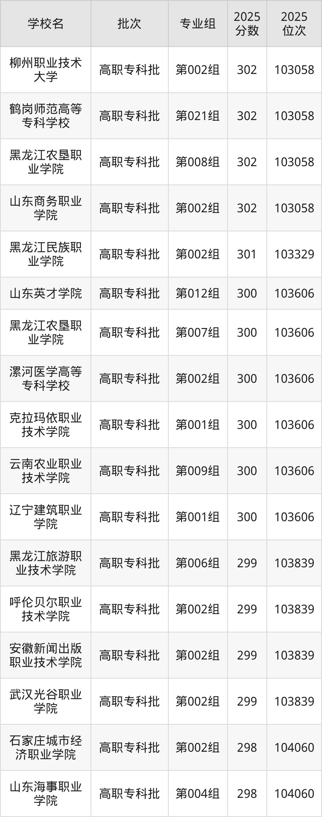 2025年黑龙江高考物理类300分(103330名~103606名)能上的大学有山东英才学院第012组、辽宁建筑职业学院第001组、黑龙江农垦职业学院第007组、漯河医学高等专科学校第002组等。