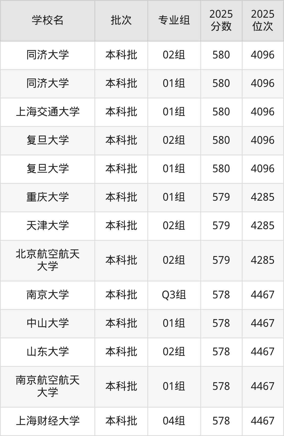 2025年上海高考580分(3935名~4096名)能上的大学有复旦大学01组、复旦大学02组、上海交通大学01组、同济大学01组等。