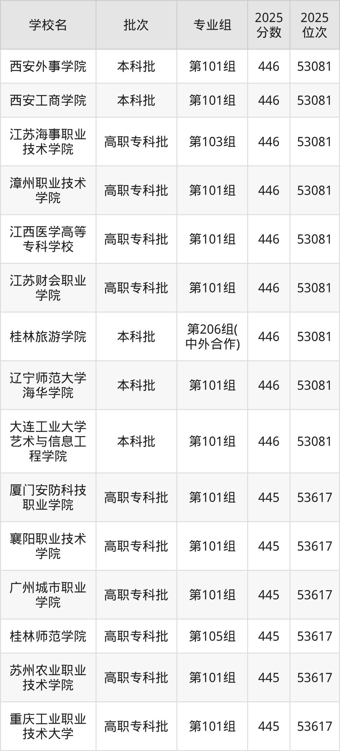 2025年湖南高考历史类445分(53082名~53617名)能上的大学有厦门安防科技职业学院第101组、襄阳职业技术学院第101组、广州城市职业学院第101组、桂林师范学院第105组等。