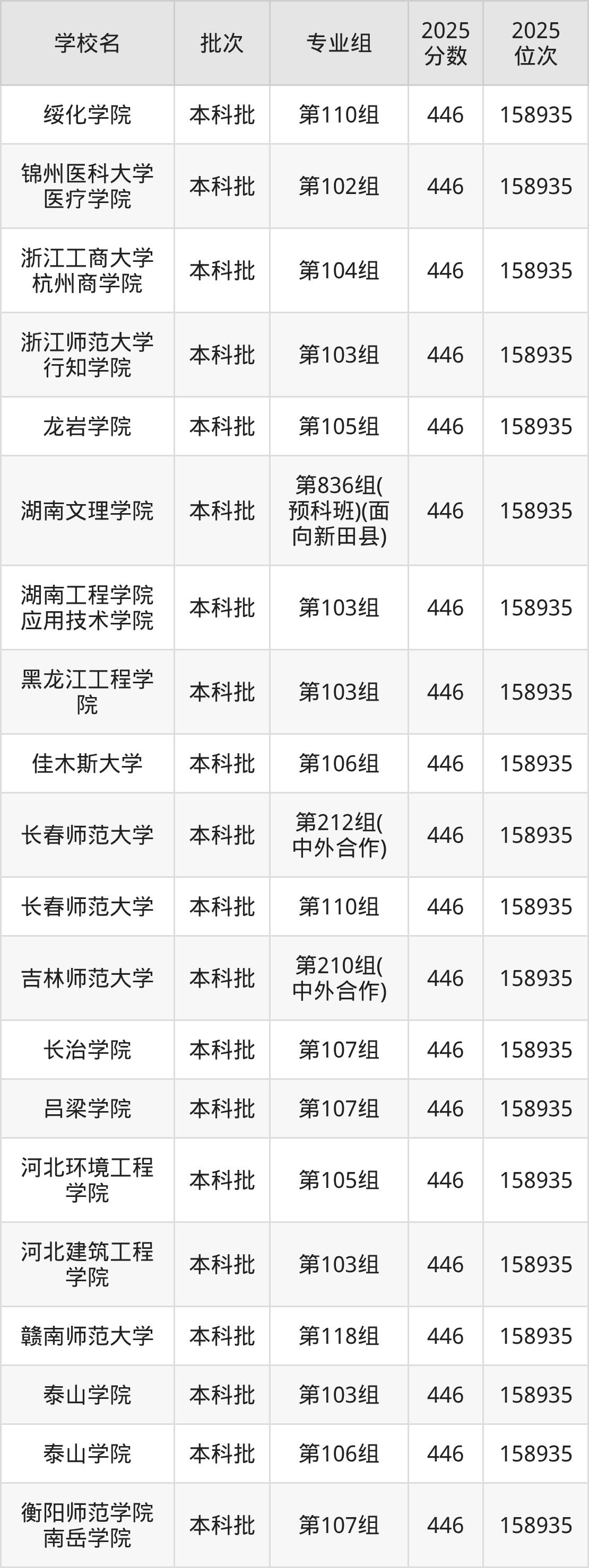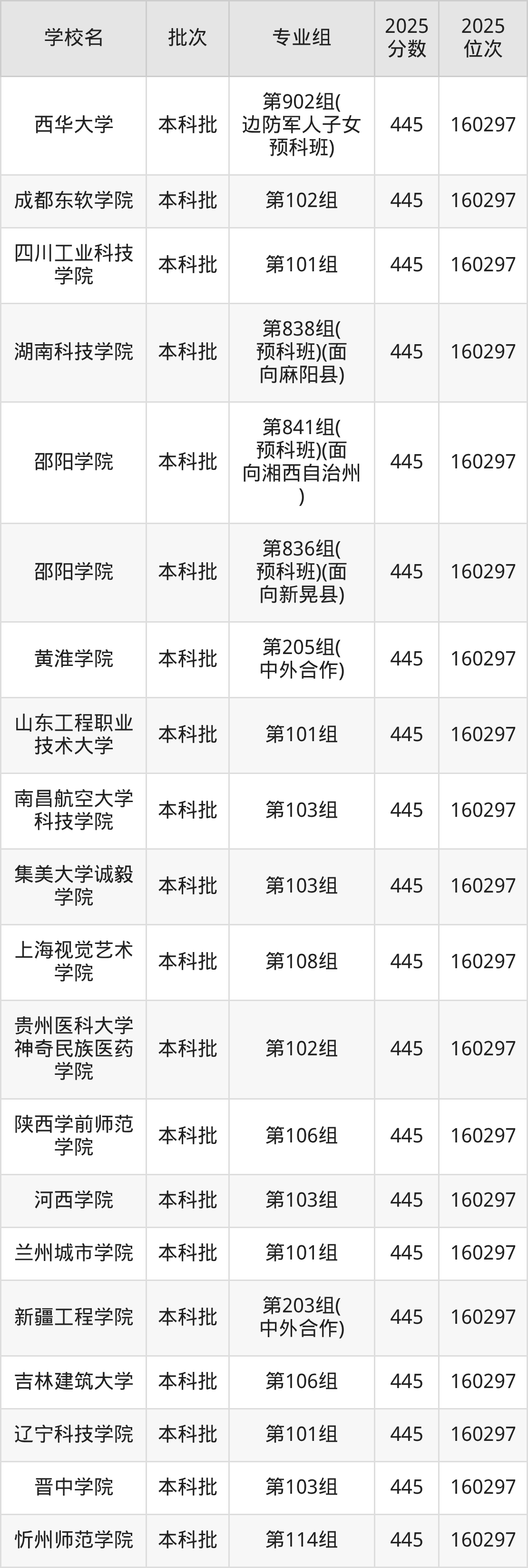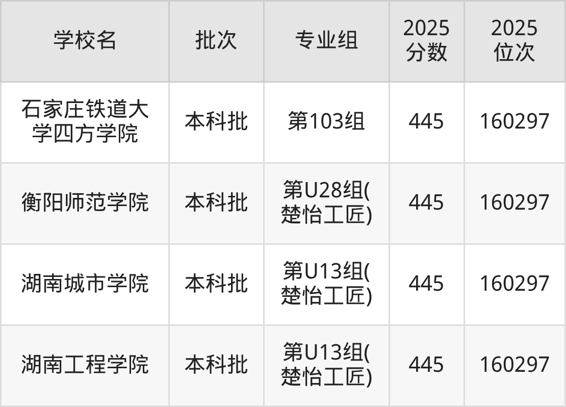 2025年湖南高考物理类445分(158936名~160297名)能上的大学有石家庄铁道大学四方学院第103组、忻州师范学院第114组、晋中学院第103组、辽宁科技学院第101组等。