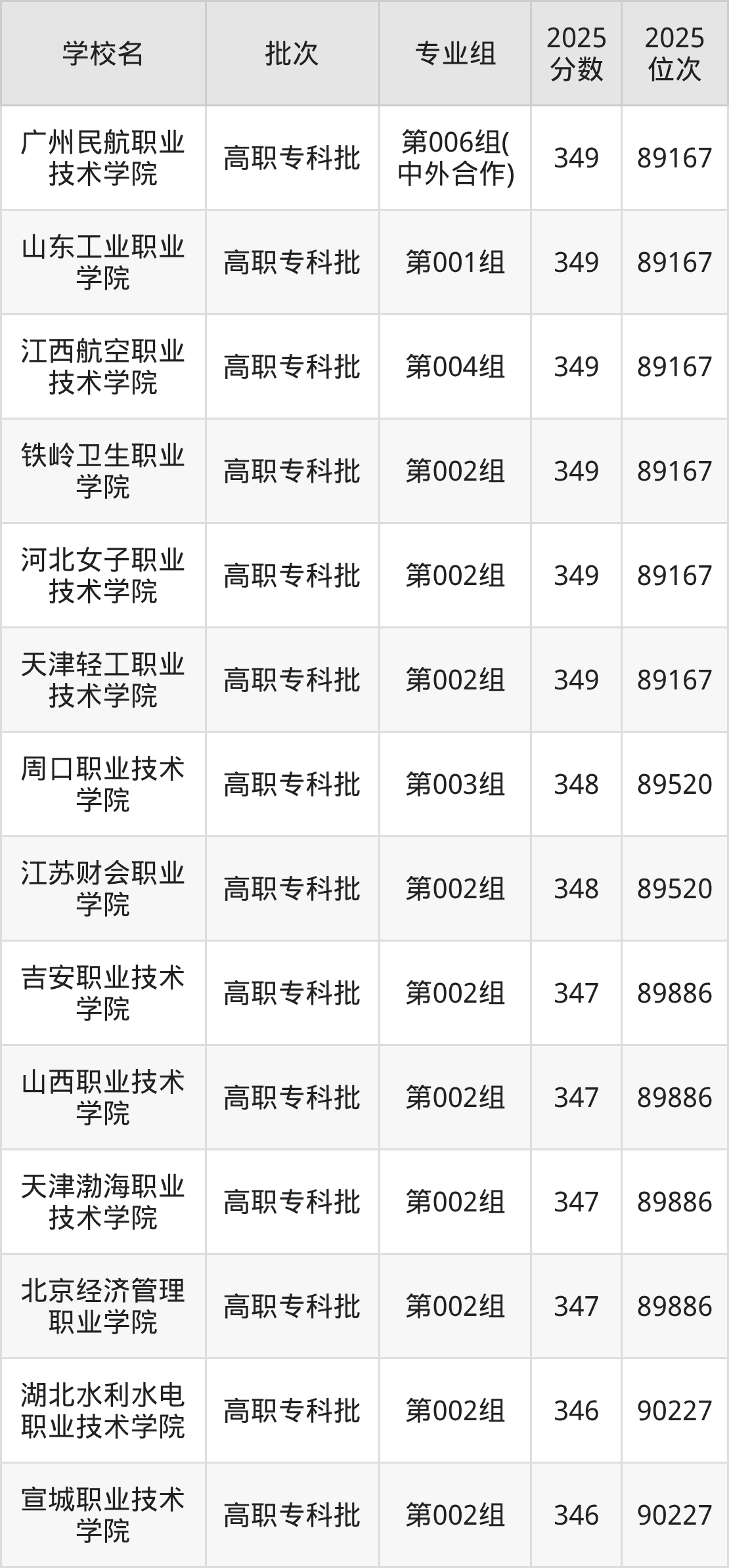 2025年黑龙江高考物理类347分(89521名~89886名)能上的大学有北京经济管理职业学院第002组、天津渤海职业技术学院第002组、山西职业技术学院第002组、吉安职业技术学院第002组。