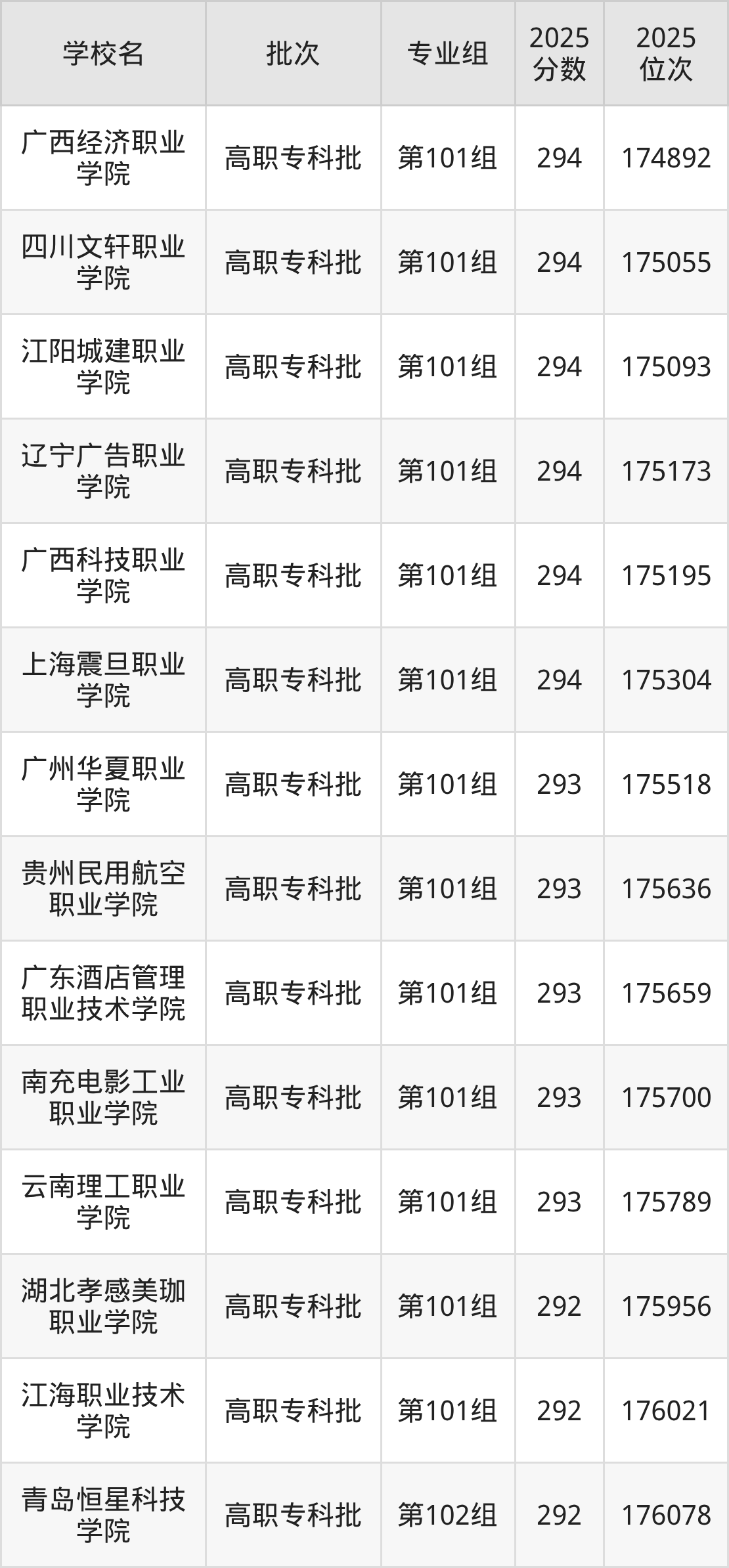 江西高考293分:历史类排名175851位、物理类排名248220位。该分数位次对应能上的大学历史类有广东酒店管理职业技术学院第101组、广州华夏职业学院第101组;物理类有黑龙江农业工程职业学院第501组、重庆科创职业学院第501组,更多名单如下文所示,2026届考生可参考。