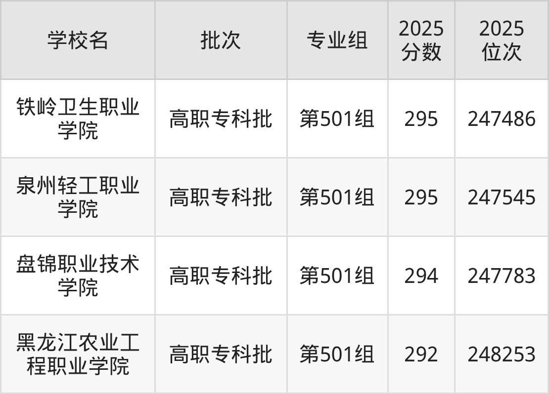 2025年江西高考物理类293分(247949名~248220名)录取位次低于该区间(较稳妥)的有黑龙江农业工程职业学院第501组(248253名)、重庆科创职业学院第501组(248863名)等;录取位次高于该区间(可冲)的有盘锦职业技术学院第501组(247783名)、泉州轻工职业学院第501组(247545名)等。