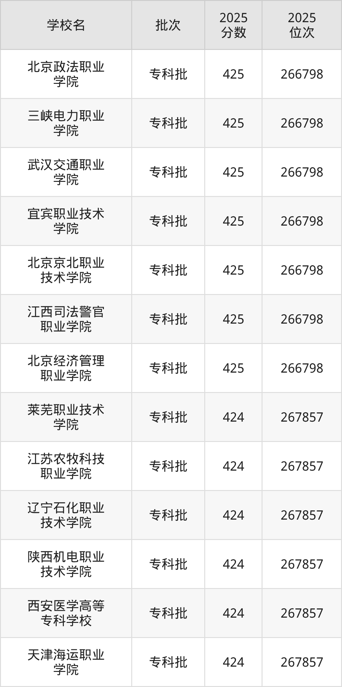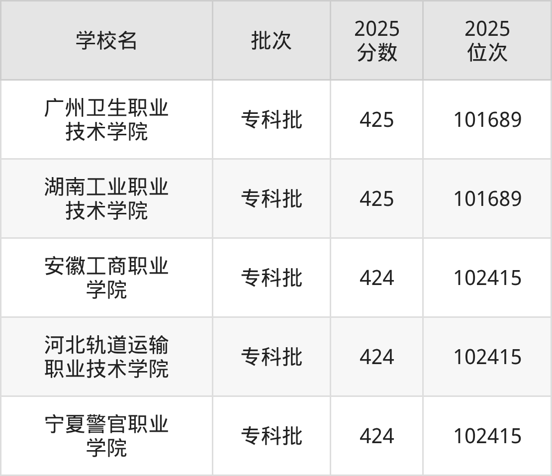 2025年河北高考历史类424分(101690名~102415名)能上的大学有宁夏警官职业学院、安徽工商职业学院、河北轨道运输职业技术学院。