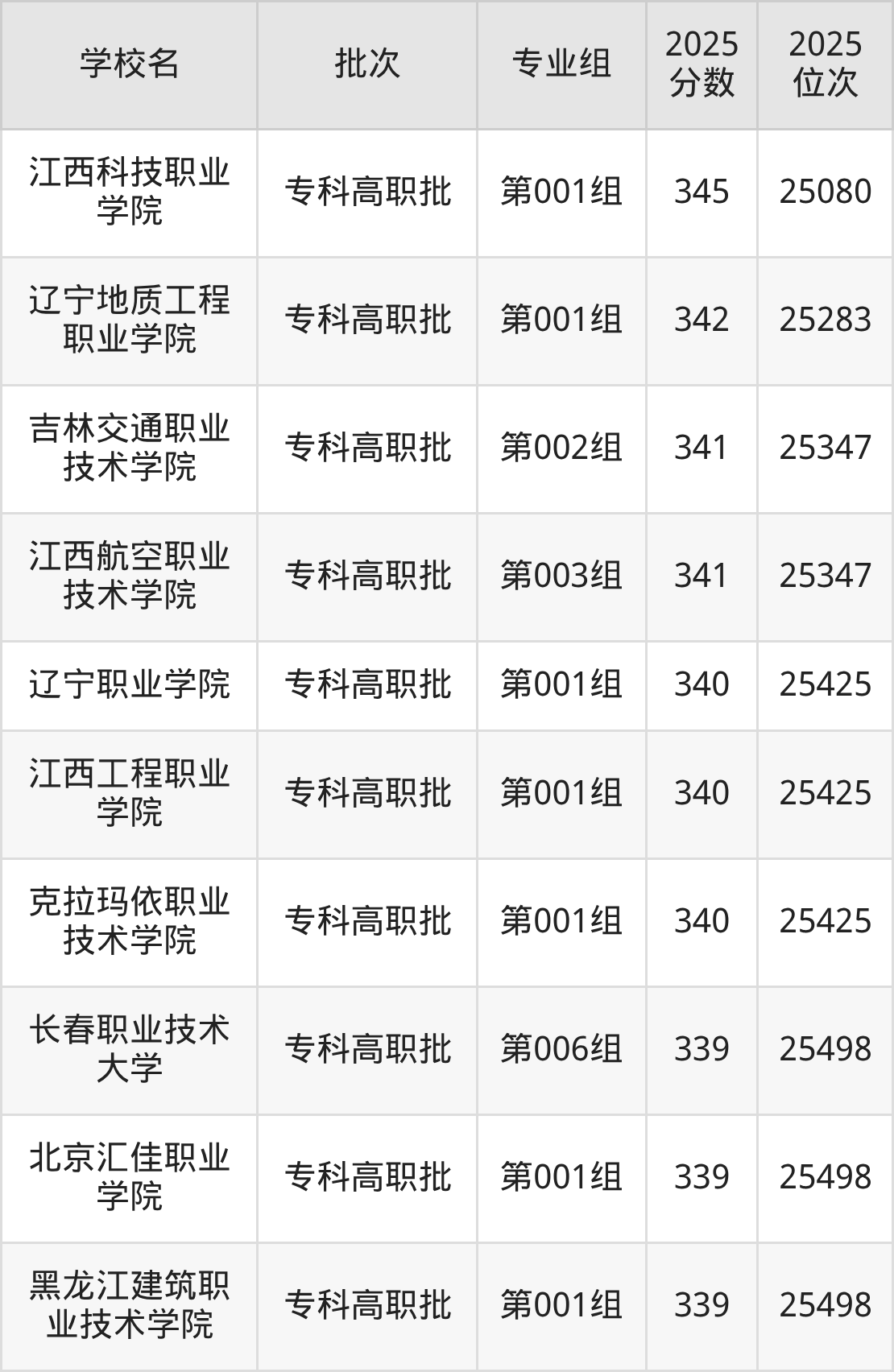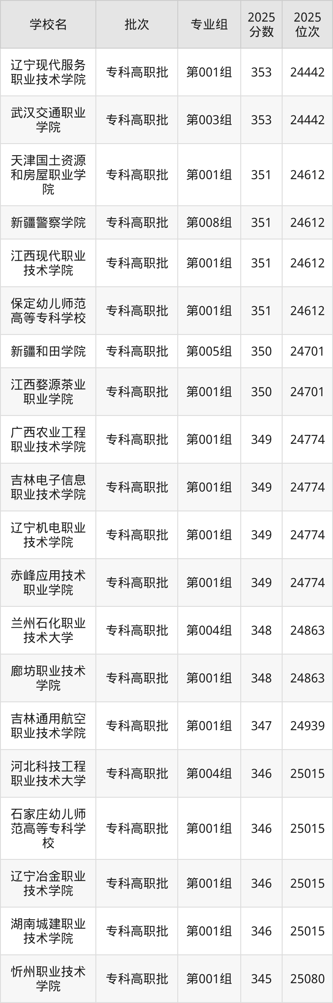 2025年吉林高考历史类346分(24940名~25015名)能上的大学有石家庄幼儿师范高等专科学校第001组、河北科技工程职业技术大学第004组、辽宁冶金职业技术学院第001组、湖南城建职业技术学院第001组。