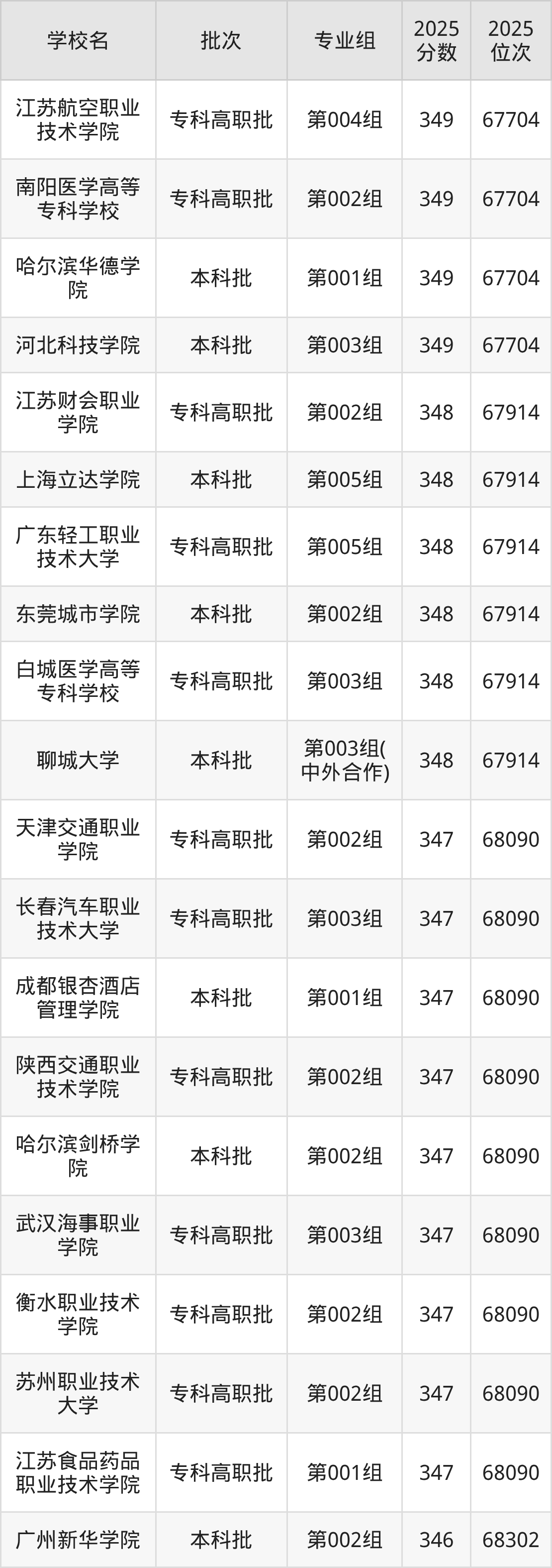 另外录取位次低于该区间(较稳妥)的有南宁学院第003组(68488名)、湖北交通职业技术学院第004组(68488名)等;录取位次高于该区间(可冲)的有哈尔滨剑桥学院第002组(68090名)、成都银杏酒店管理学院第001组(68090名)等。