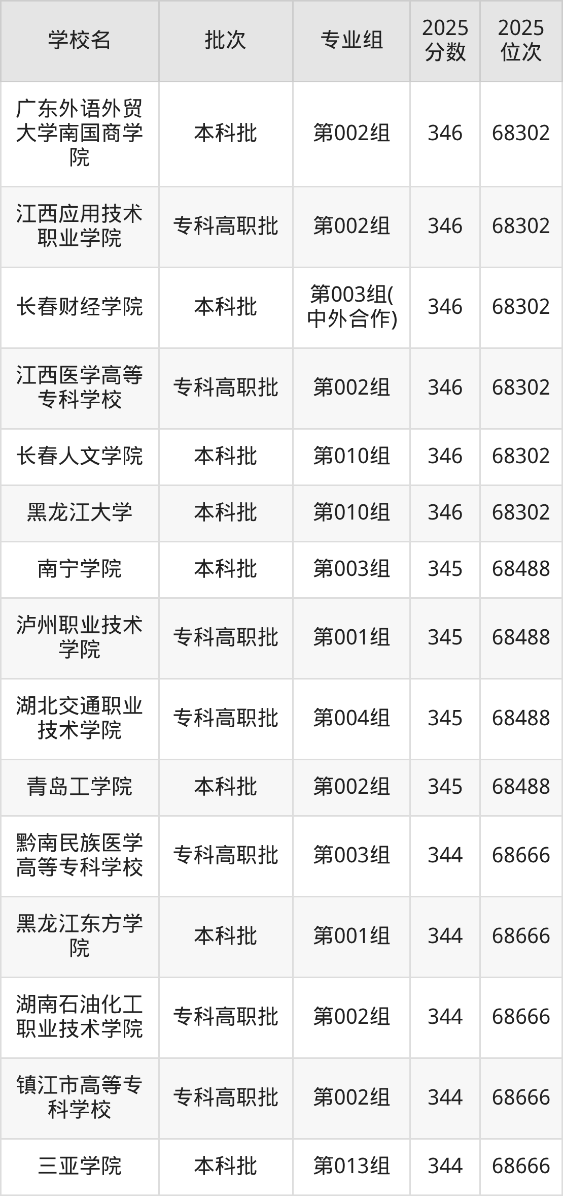 2025年吉林高考物理类346分(68091名~68302名)能上的大学有长春财经学院第003组(中外合作)、长春人文学院第010组、黑龙江大学第010组、广东外语外贸大学南国商学院第002组等。