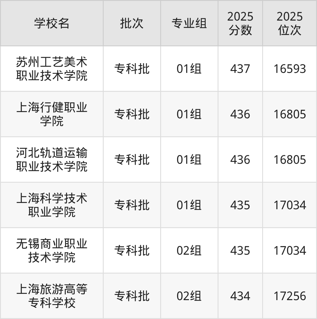 2025年江苏高考历史类435分(16806名~17034名)能上的大学有无锡商业职业技术学院02组、上海科学技术职业学院01组。