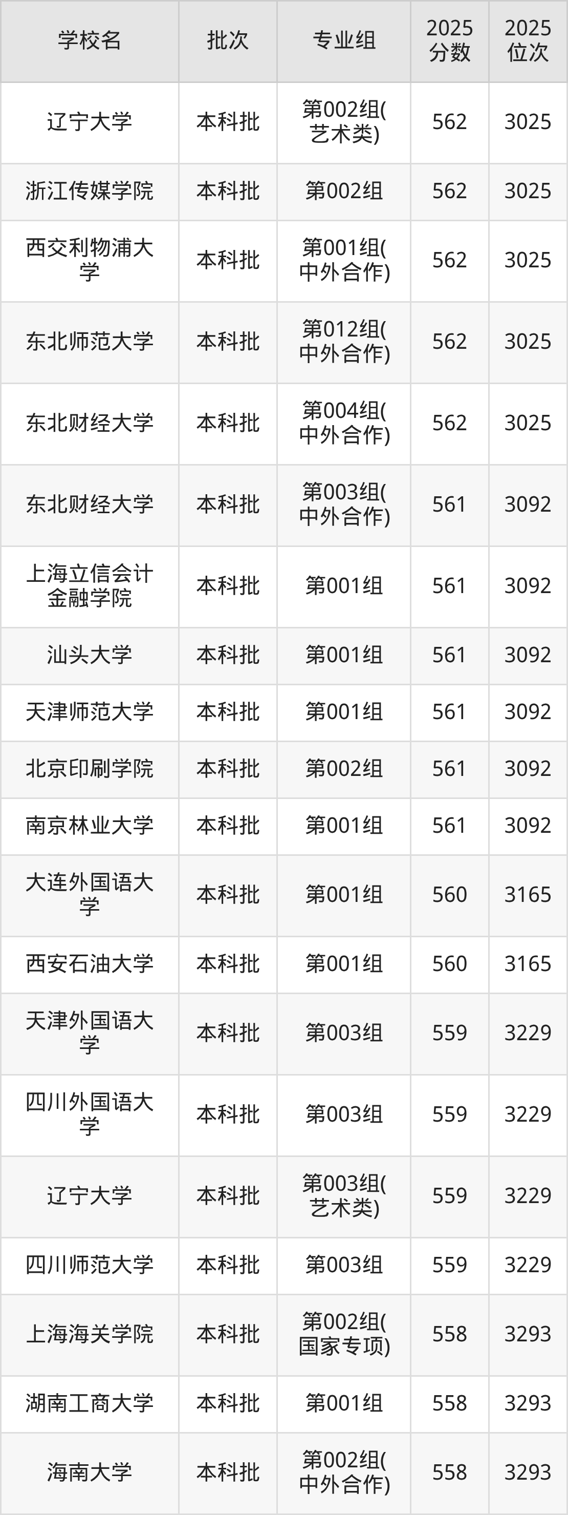 2025年吉林高考历史类558分(3230名~3293名)能上的大学有上海海关学院第002组(国家专项)、湖南工商大学第001组、海南大学第002组(中外合作)。