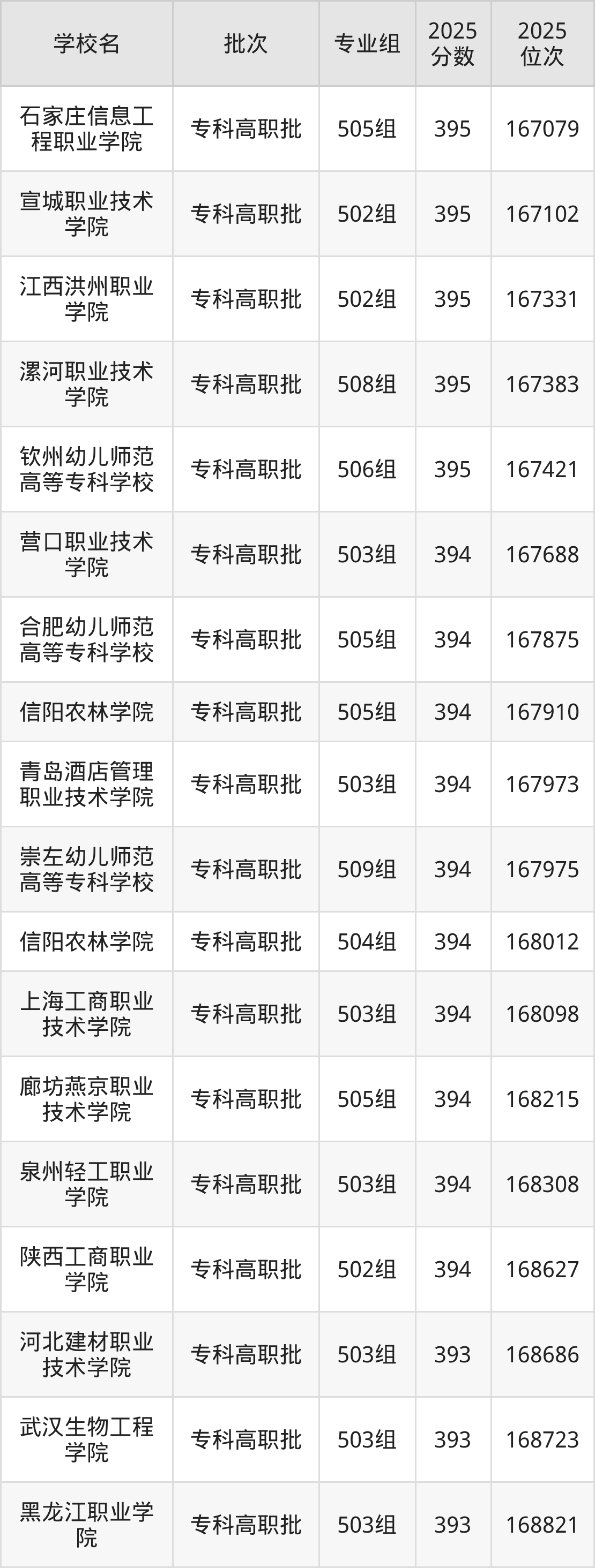 2025年广东高考历史类394分(167502名~168655名)能上的大学有营口职业技术学院503组、上海工商职业技术学院503组、信阳农林学院504组、信阳农林学院505组等。