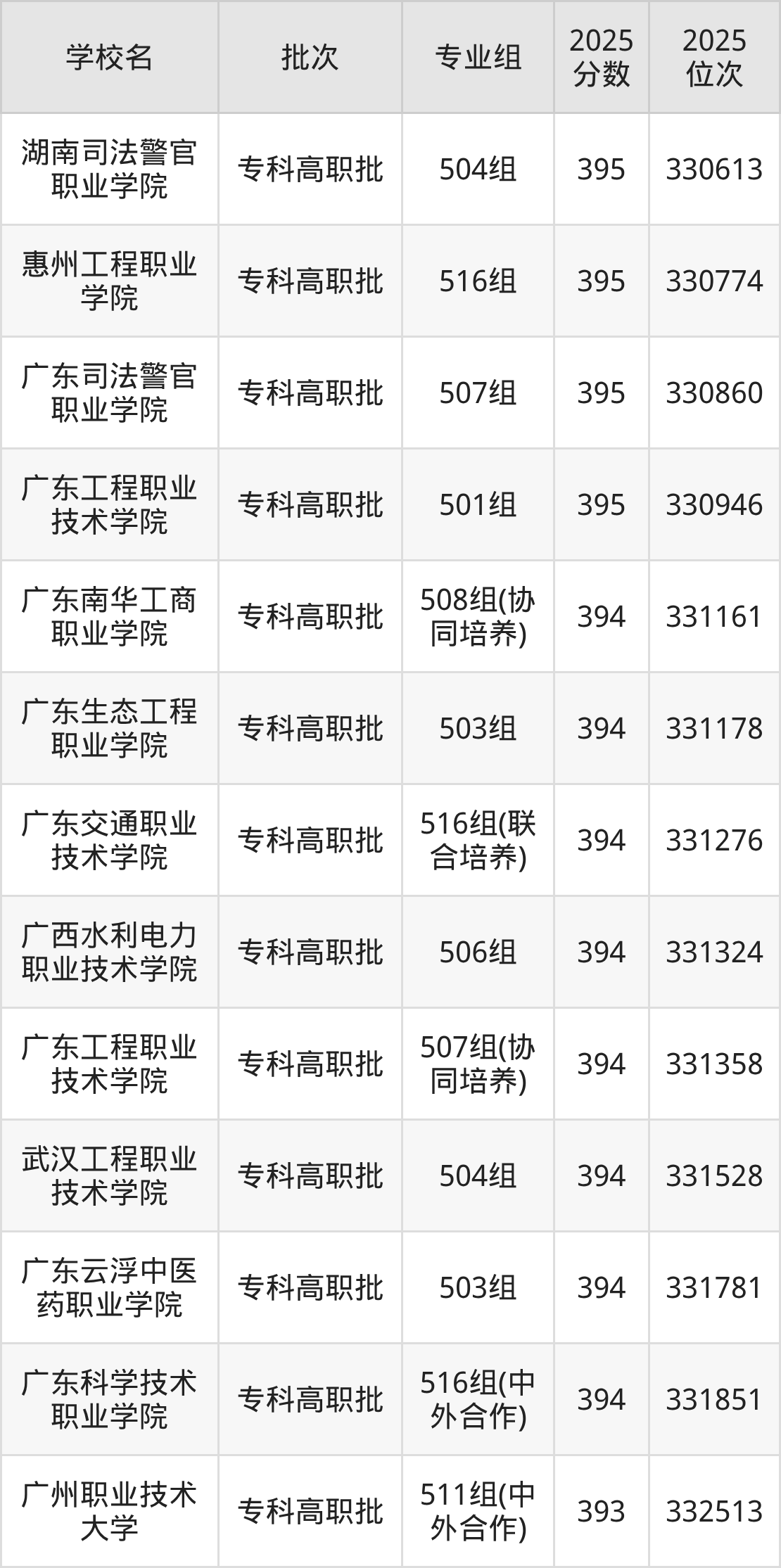 另外录取位次低于该区间(较稳妥)的有广州职业技术大学511组(中外合作)(332513名)、徐州工业职业技术学院504组(332554名)等;录取位次高于该区间(可冲)的有广东工程职业技术学院501组(330946名)、广东司法警官职业学院507组(330860名)等。