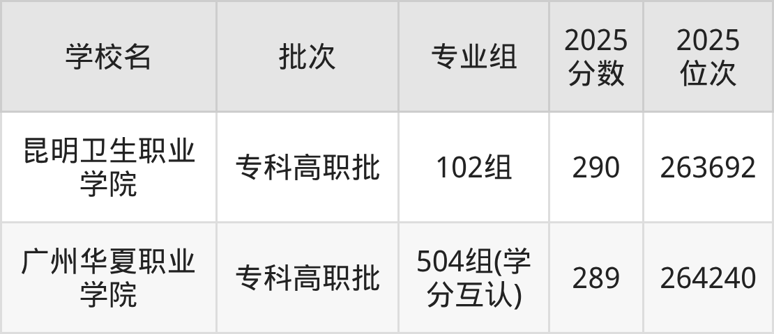 2025年广东高考历史类290分(263386名~263978名)能上的大学有昆明卫生职业学院102组。