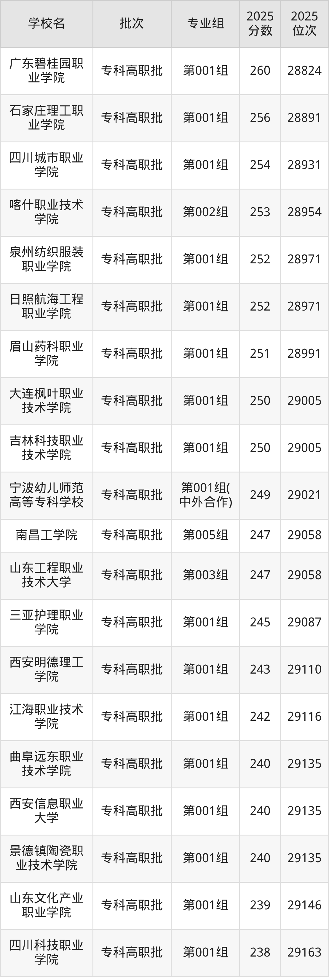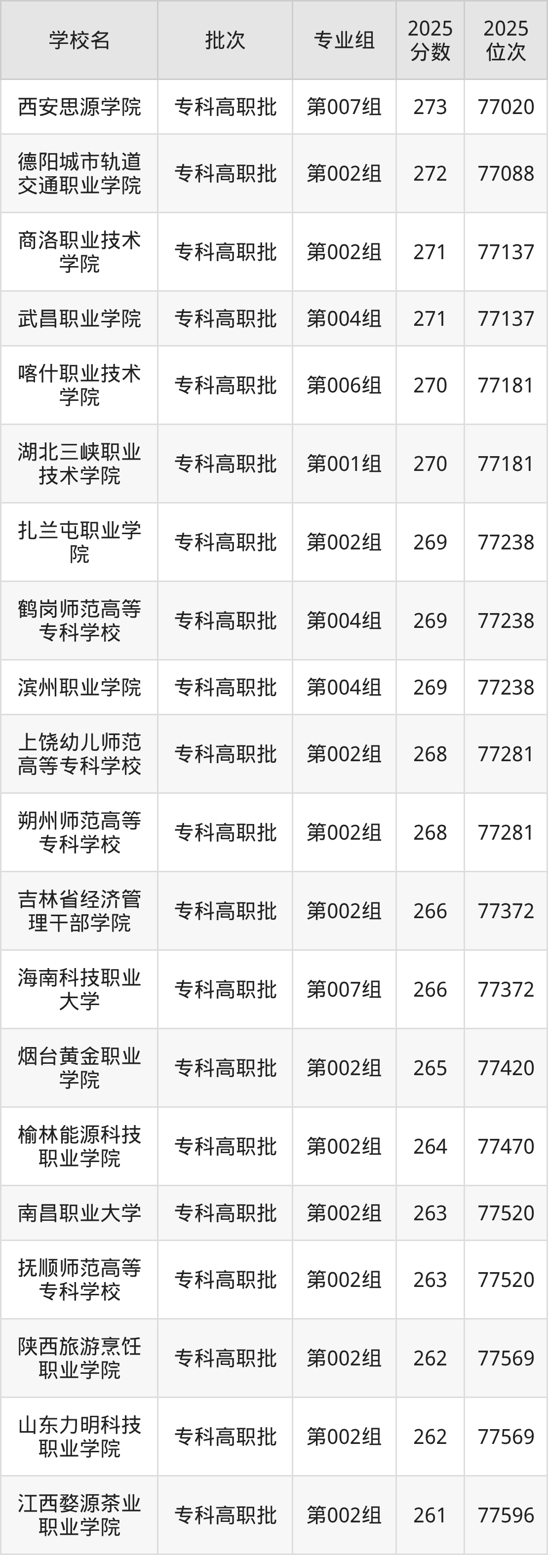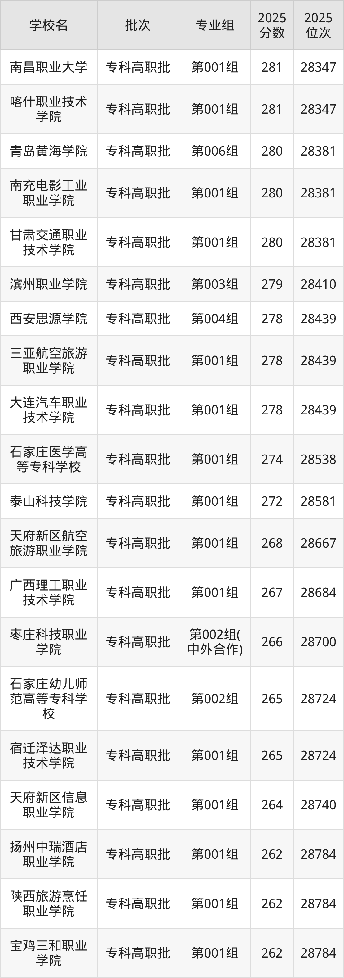 2025年吉林高考历史类262分(28759名~28784名)能上的大学有扬州中瑞酒店职业学院第001组、陕西旅游烹饪职业学院第001组、宝鸡三和职业学院第001组。