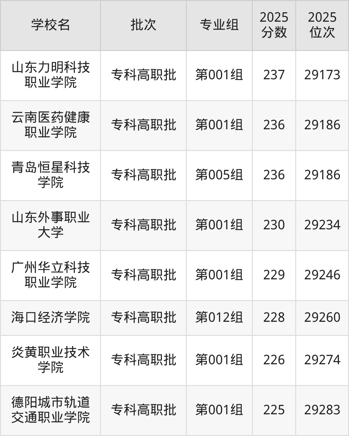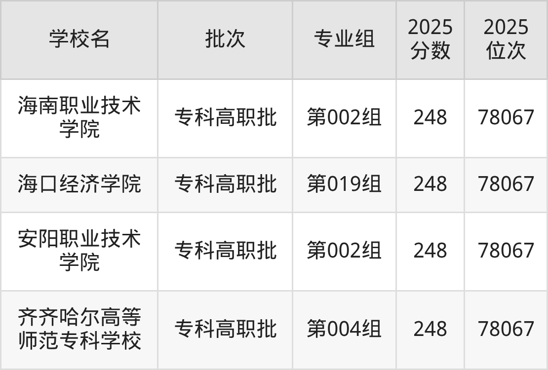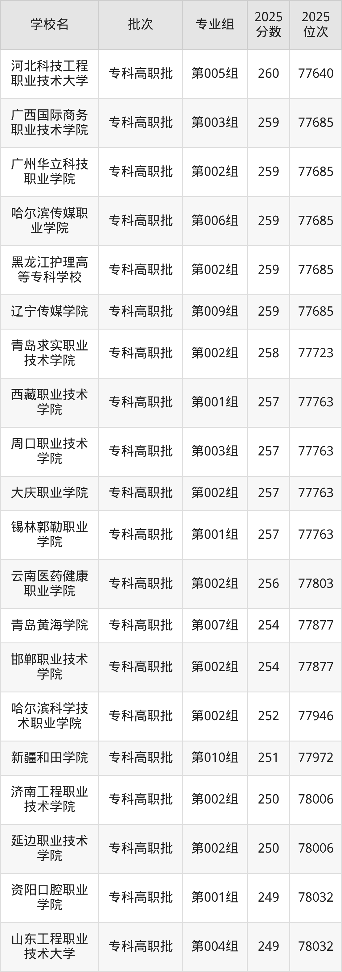 2025年吉林高考历史类262分(28759名~28784名)能上的大学有扬州中瑞酒店职业学院第001组、陕西旅游烹饪职业学院第001组、宝鸡三和职业学院第001组。