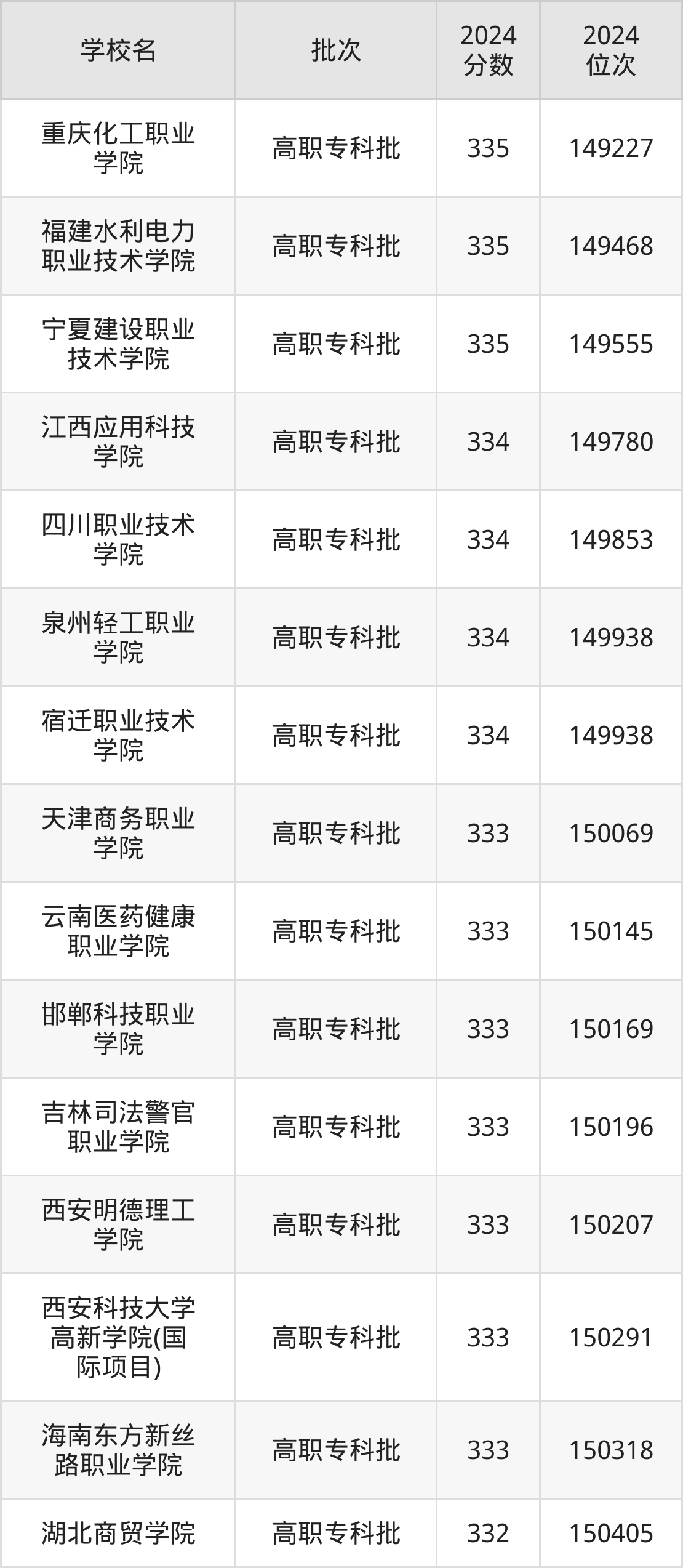 2024年陕西高考理科334分(149560名~149938名)能上的大学有宿迁职业技术学院、江西应用科技学院、泉州轻工职业学院、四川职业技术学院。