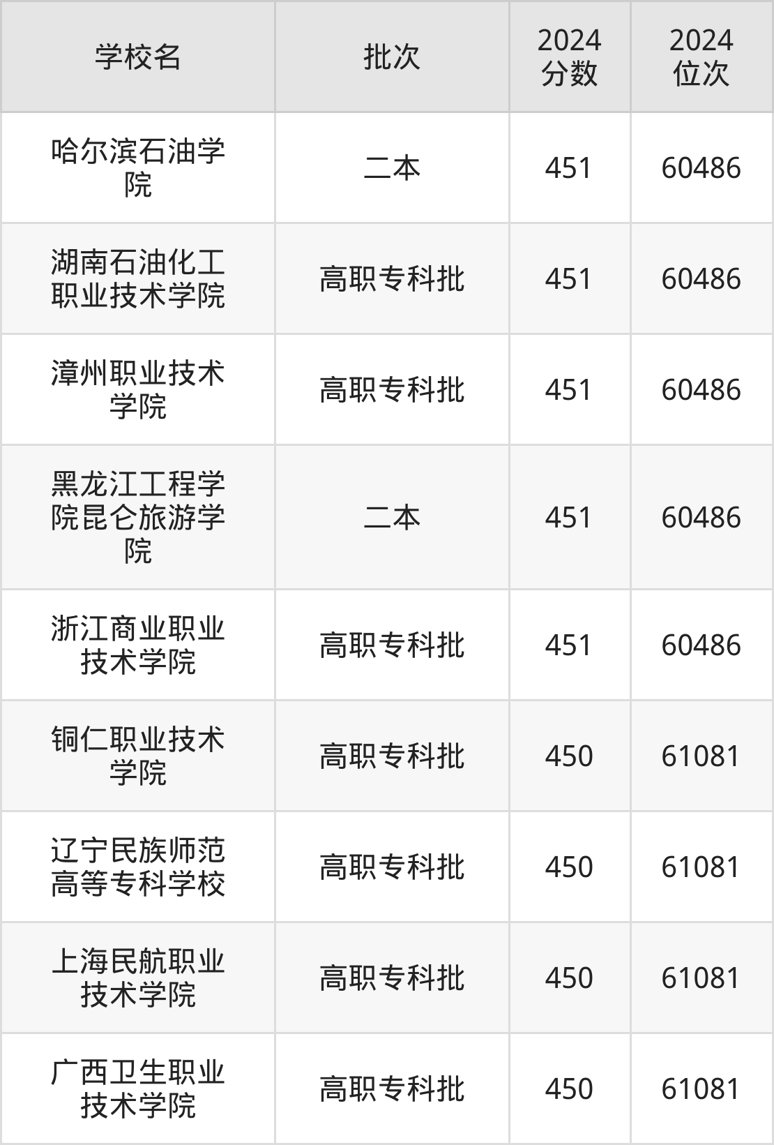 2024年云南高考文科450分(60487名~61081名)能上的大学有上海民航职业技术学院、广西卫生职业技术学院、辽宁民族师范高等专科学校、铜仁职业技术学院。