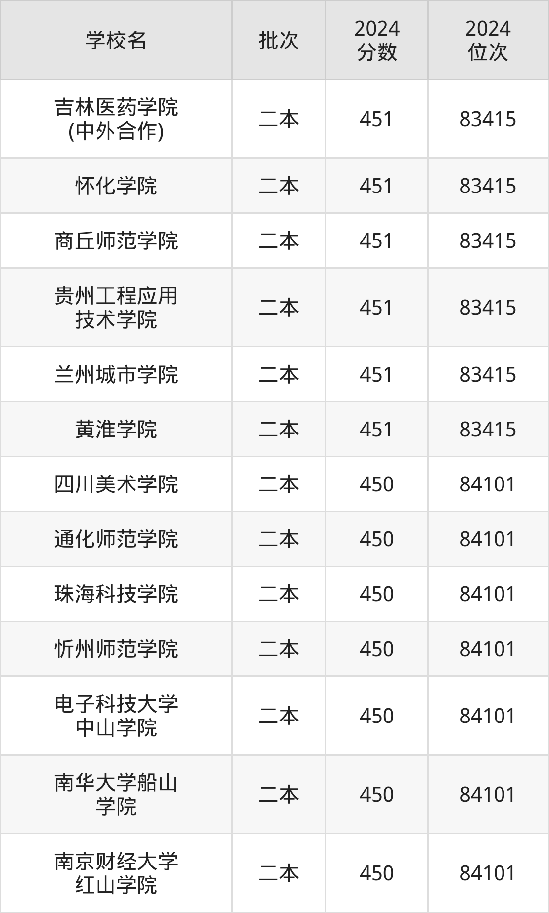 2024年云南高考理科450分(83416名~84101名)能上的大学有南京财经大学红山学院、南华大学船山学院、电子科技大学中山学院、忻州师范学院等。