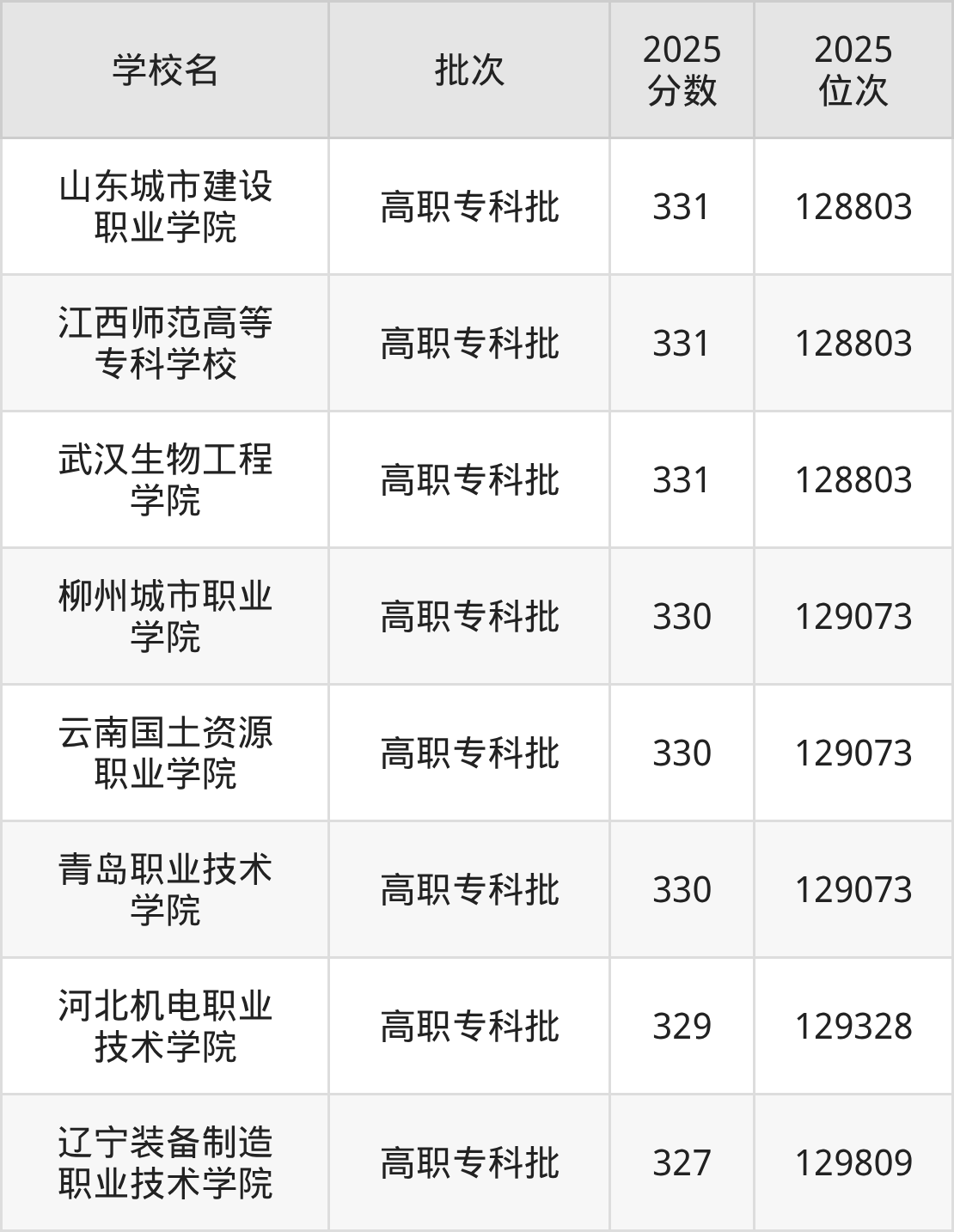 另外录取位次低于该区间(较稳妥)的有辽宁装备制造职业技术学院(129809名)、山东经贸职业学院(130062名)等;录取位次高于该区间(可冲)的有青岛职业技术学院(129073名)、柳州城市职业学院(129073名)等。