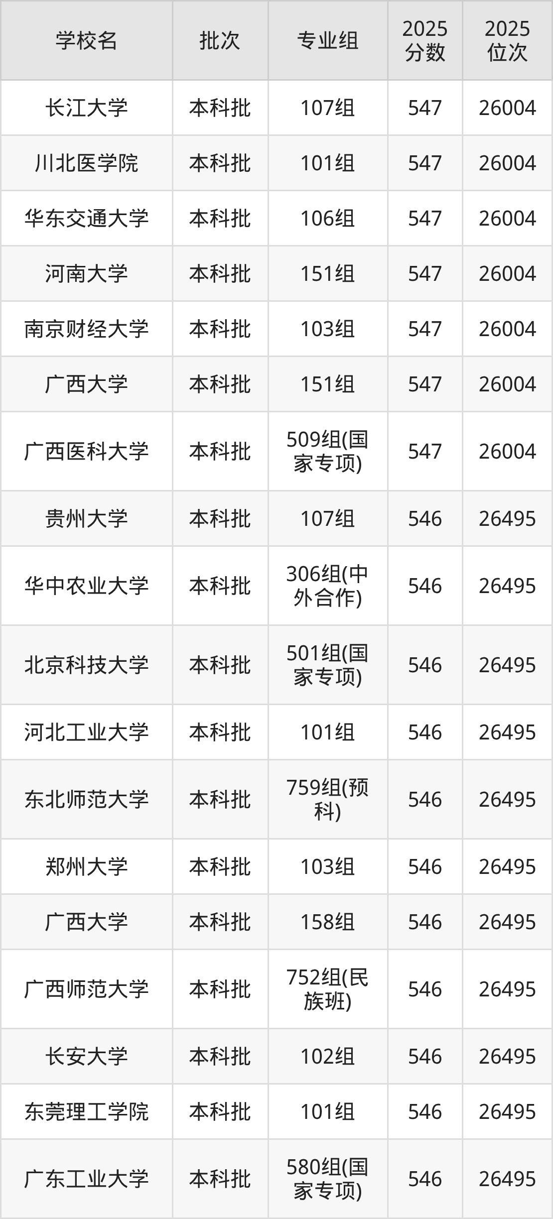 2025年广西高考物理类546分(26005名~26495名)能上的大学有北京科技大学501组(国家专项)、河北工业大学101组、东北师范大学759组(预科)、郑州大学103组等。