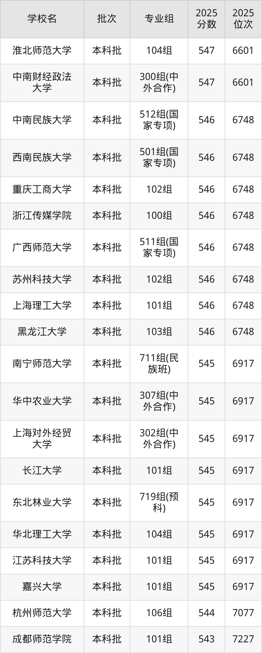 2025年广西高考历史类546分(6602名~6748名)能上的大学有黑龙江大学103组、上海理工大学101组、苏州科技大学102组、中南民族大学512组(国家专项)等。