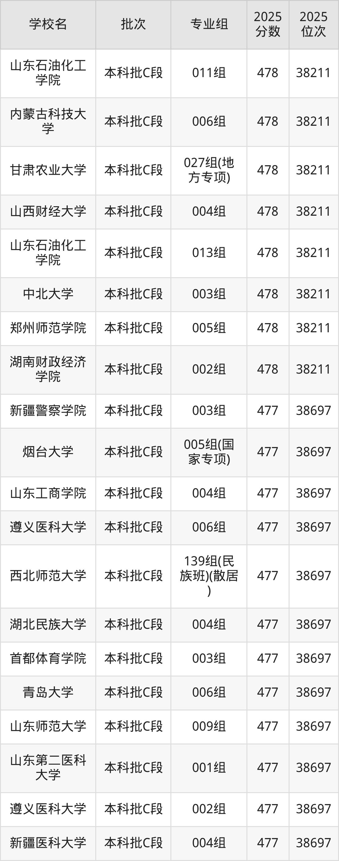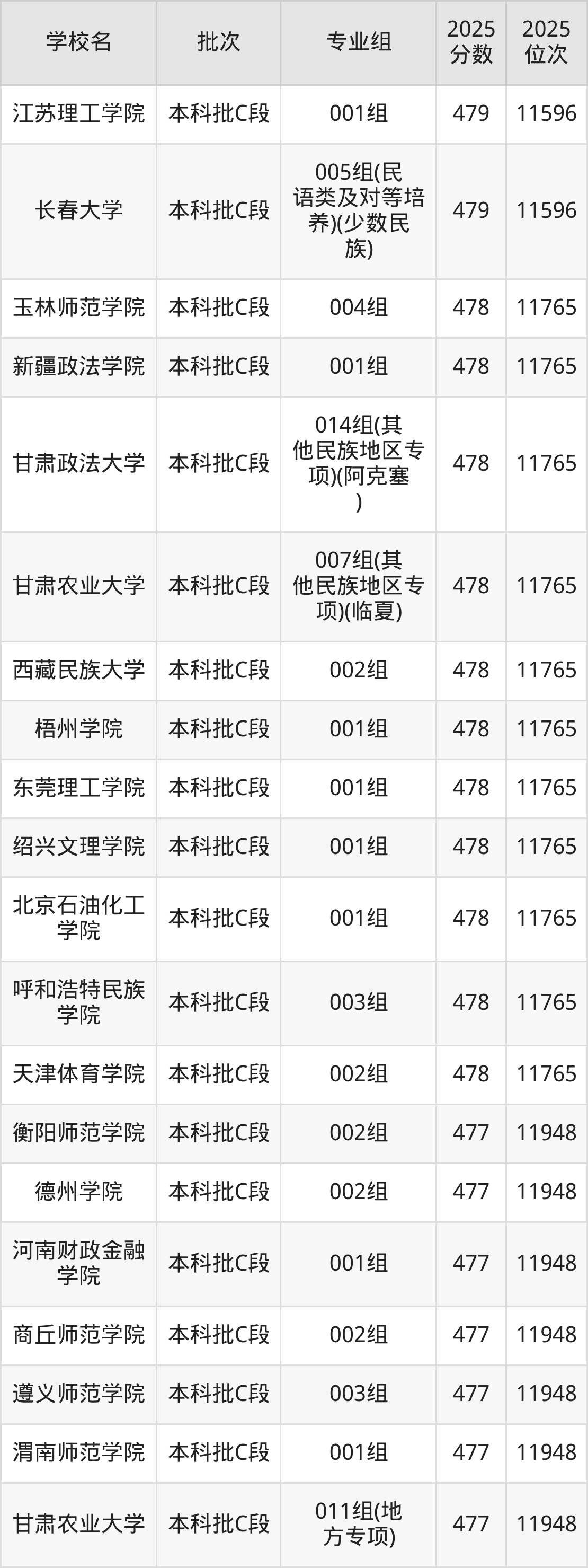 2025年甘肃高考历史类478分(11597名~11765名)能上的大学有北京石油化工学院001组、天津体育学院002组、呼和浩特民族学院003组、绍兴文理学院001组等。