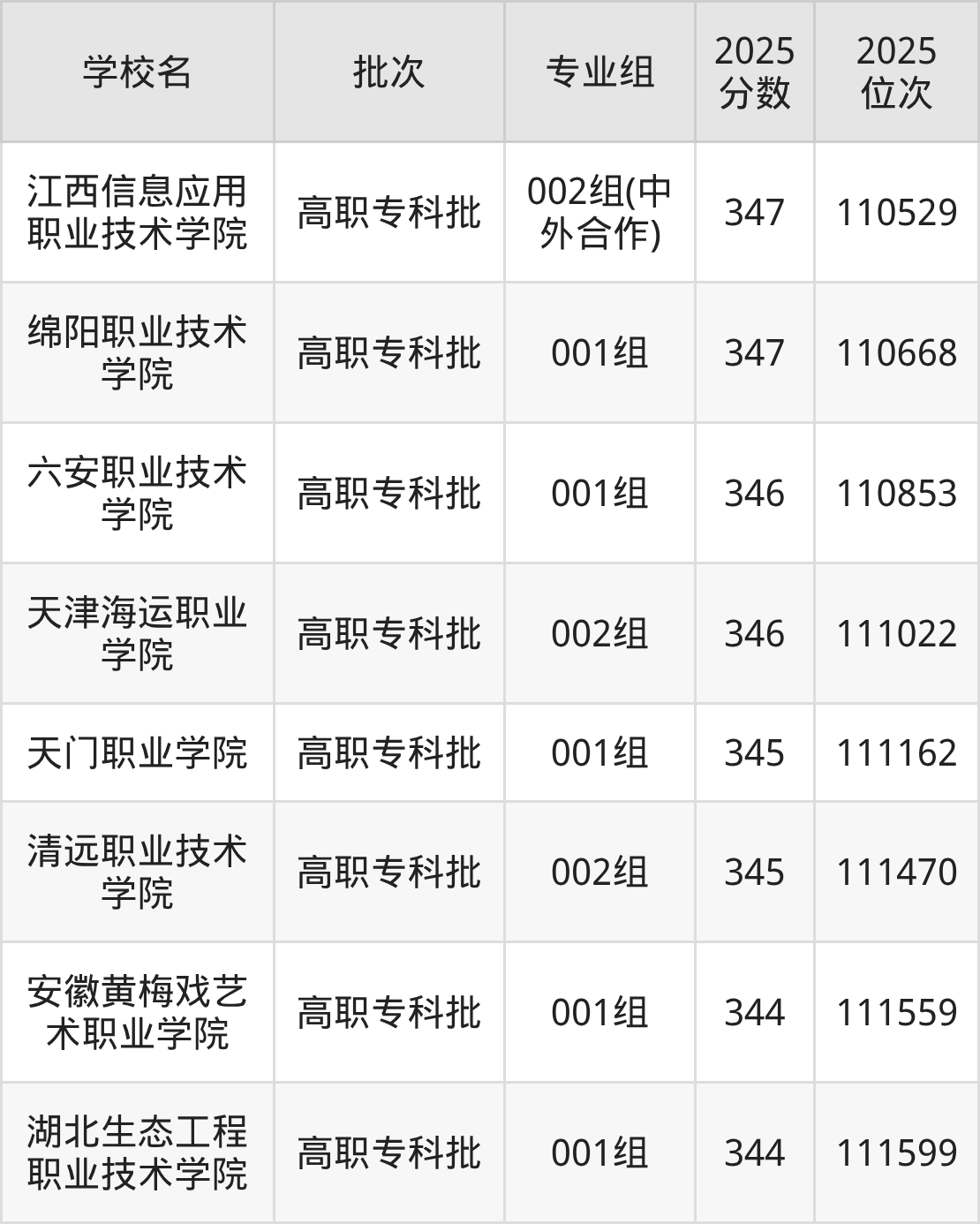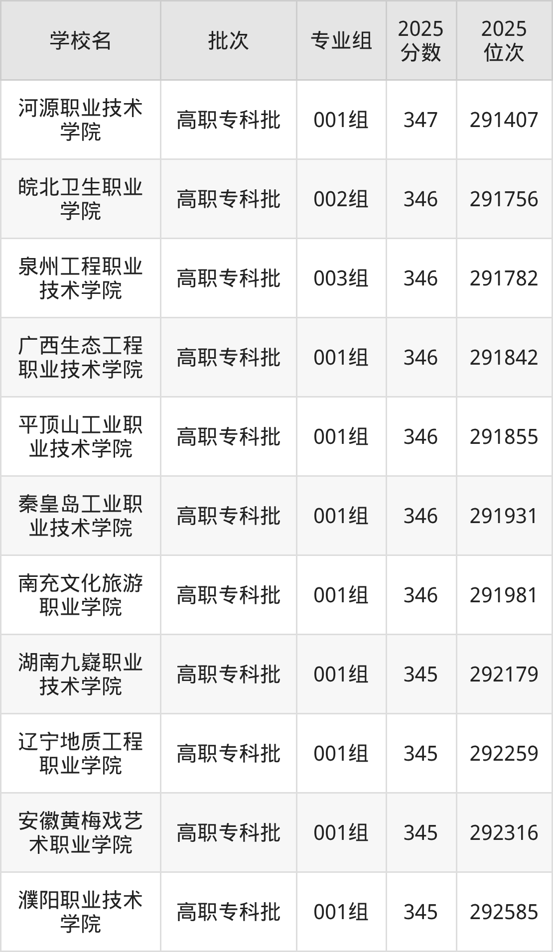 2025年安徽高考物理类346分(291705名~292155名)能上的大学有广西生态工程职业技术学院001组、南充文化旅游职业学院001组、平顶山工业职业技术学院001组、秦皇岛工业职业技术学院001组等。