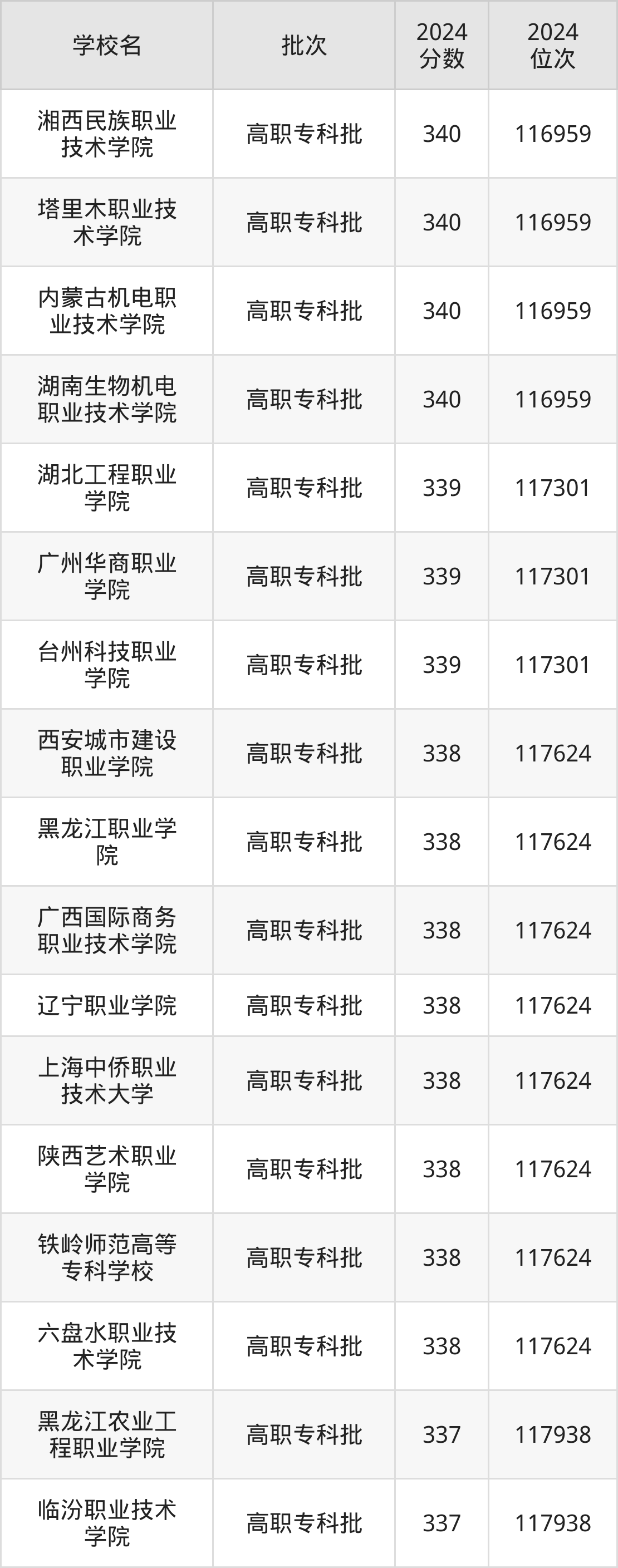 另外录取位次低于该区间(较稳妥)的有临汾职业技术学院(117938名)、黑龙江农业工程职业学院(117938名)等;录取位次高于该区间(可冲)的有广州华商职业学院(117301名)、湖北工程职业学院(117301名)等。