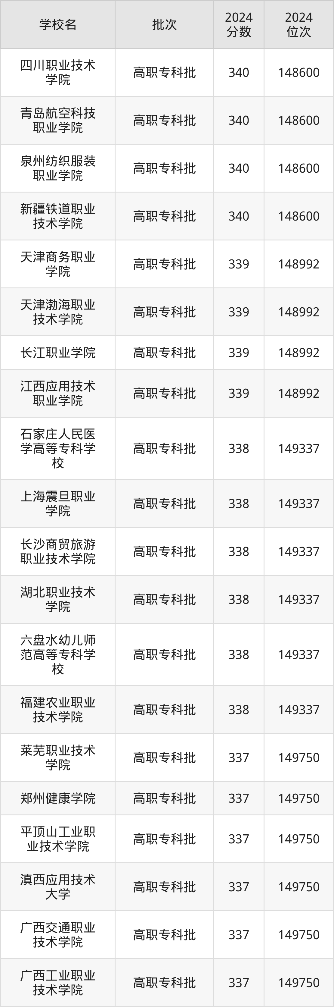2024年云南高考理科338分(148993名~149337名)能上的大学有石家庄人民医学高等专科学校、福建农业职业技术学院、六盘水幼儿师范高等专科学校、湖北职业技术学院等。