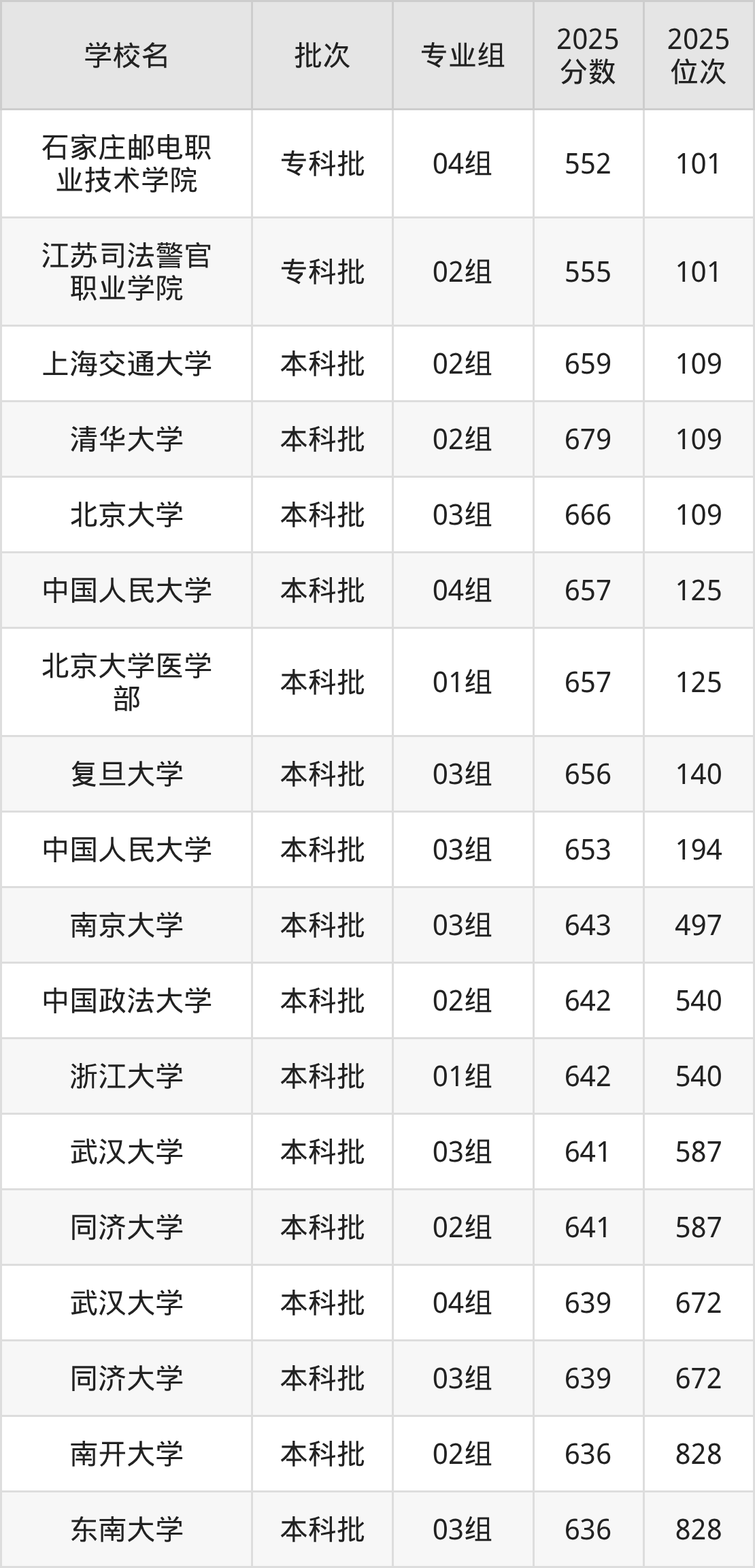 2025年江苏高考历史类646分(337名~381名)录取位次低于该区间(较稳妥)的有江苏司法警官职业学院02组(101名)、石家庄邮电职业技术学院04组(101名)等;录取位次高于该区间(可冲)的有中国人民大学03组(194名)、复旦大学03组(140名)等。