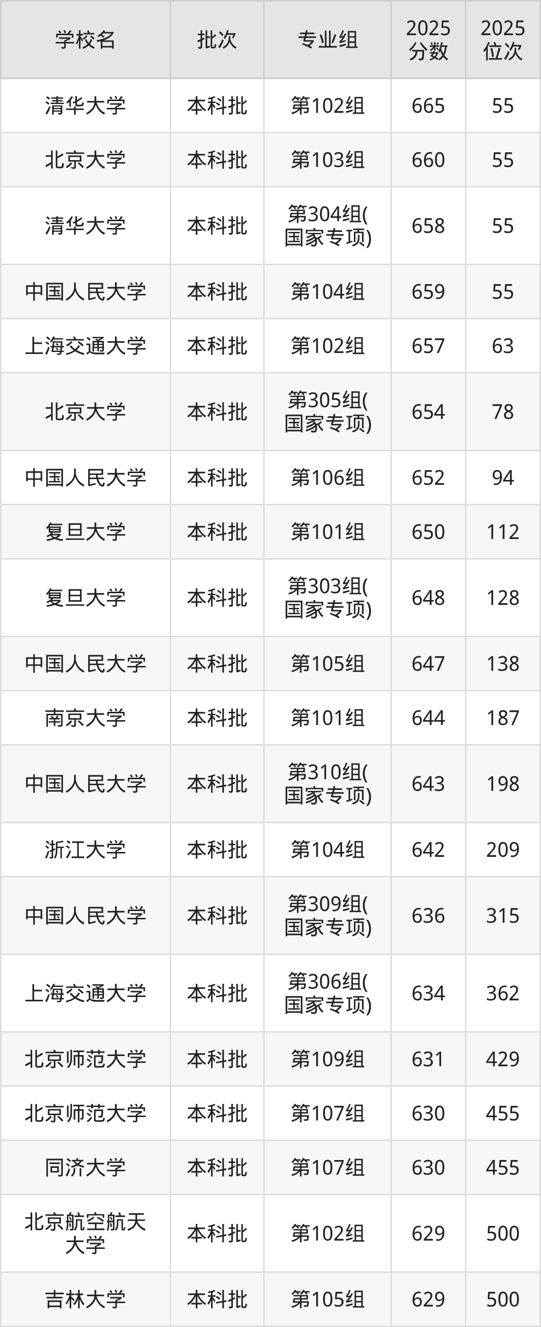 2025年湖南高考物理类657分(1369名~1460名)录取位次低于该区间(较稳妥)的有中国科学技术大学第302组(国家专项)(1665名)、中南大学第119组(1665名)等;录取位次高于该区间(可冲)的有北京理工大学第104组(1269名)、哈尔滨工业大学(深圳)第102组(1269名)等。