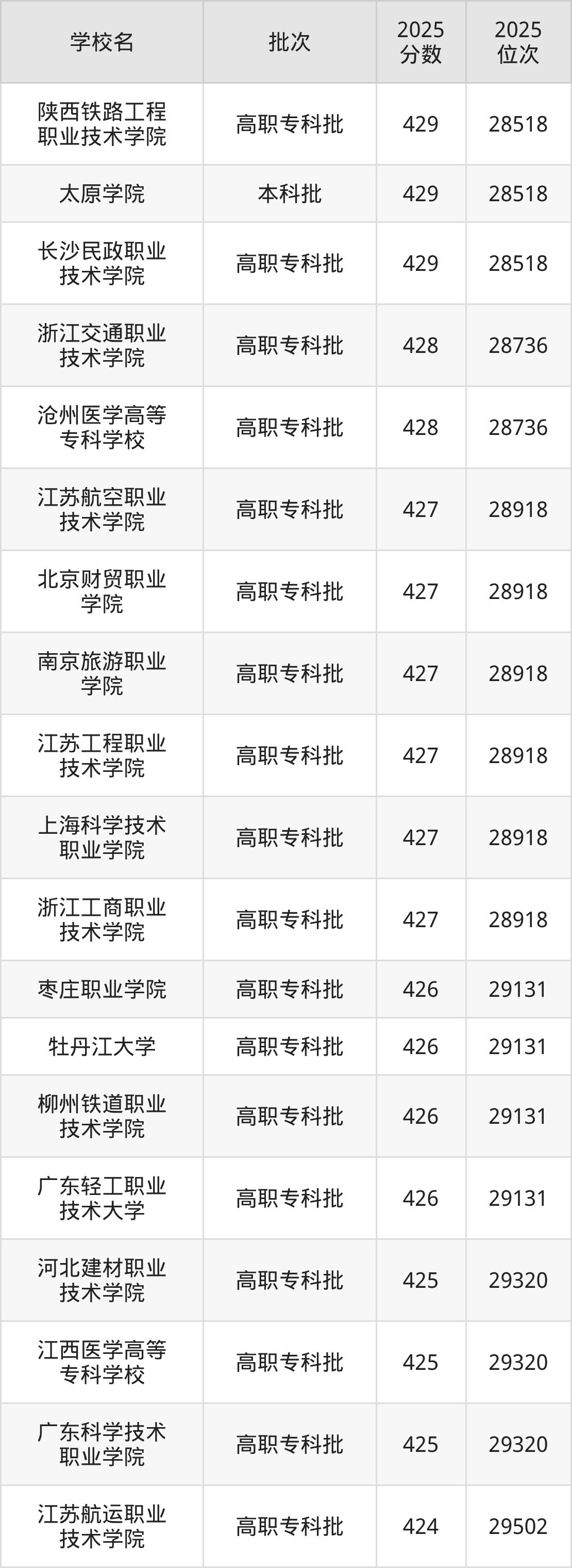 2025年辽宁高考历史类426分(28919名~29131名)能上的大学有牡丹江大学、枣庄职业学院、广东轻工职业技术大学、柳州铁道职业技术学院。