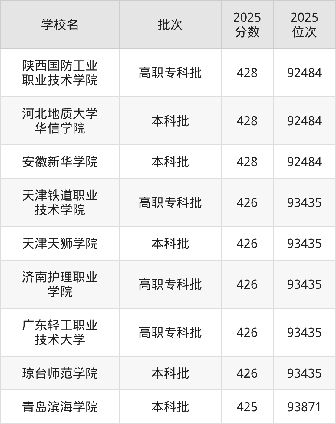 2025年辽宁高考物理类426分(92952名~93435名)能上的大学有济南护理职业学院、天津天狮学院、琼台师范学院、天津铁道职业技术学院等。