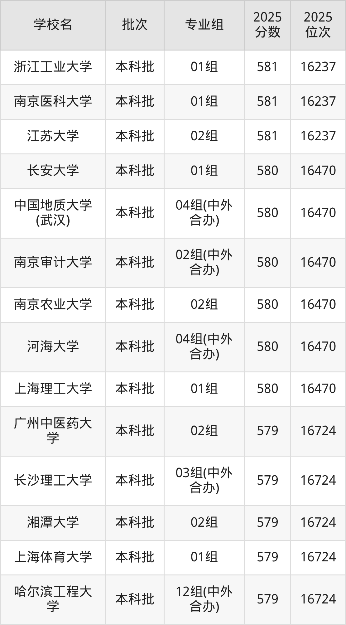 2025年北京高考580分(16238名~16470名)能上的大学有上海理工大学01组、河海大学04组(中外合办)、南京农业大学02组、南京审计大学02组(中外合办)等。