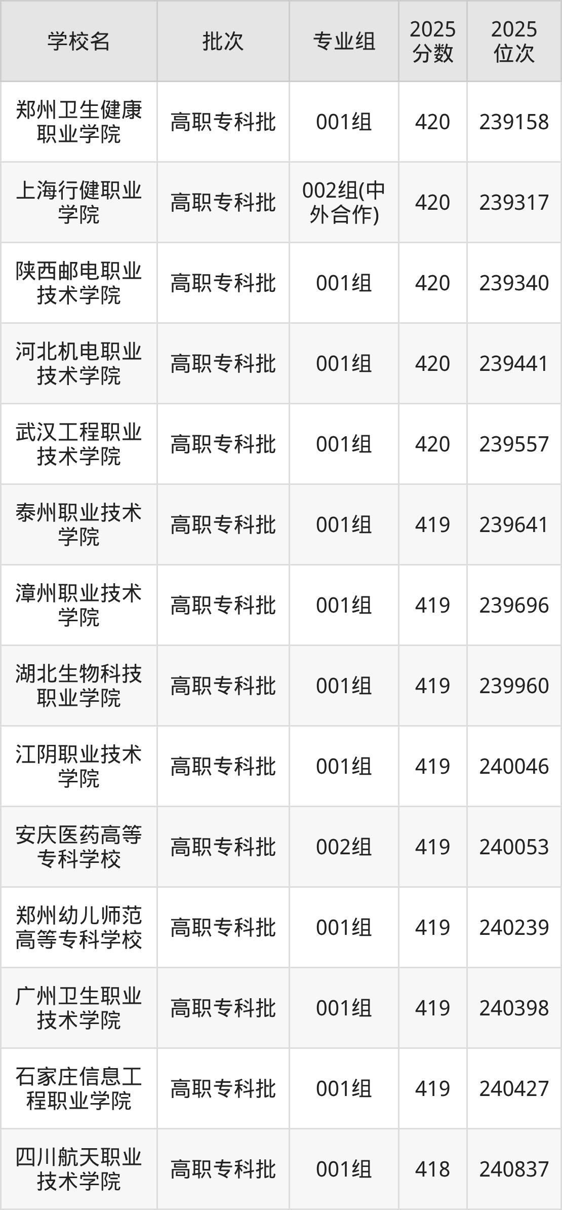 2025年安徽高考物理类419分(239559名~240505名)能上的大学有广州卫生职业技术学院001组、湖北生物科技职业学院001组、江阴职业技术学院001组、石家庄信息工程职业学院001组等。