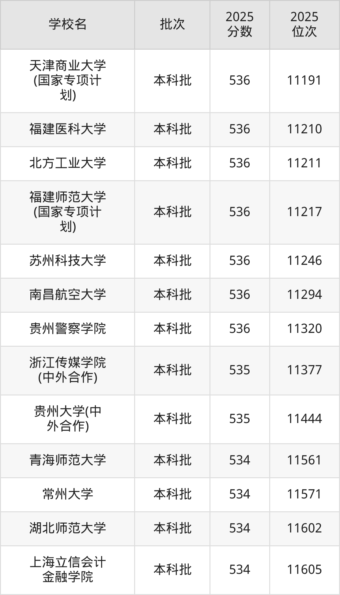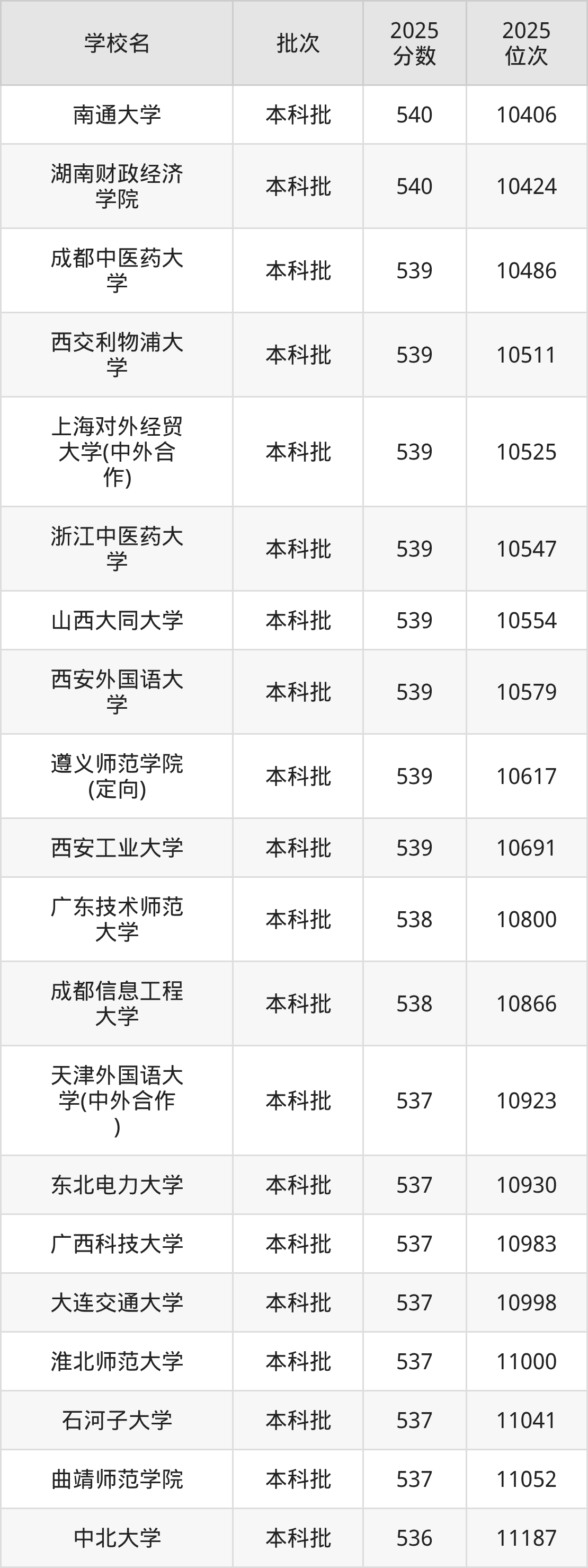 2025年贵州高考历史类537分(10905名~11111名)能上的大学有石河子大学、东北电力大学、淮北师范大学、大连交通大学等。