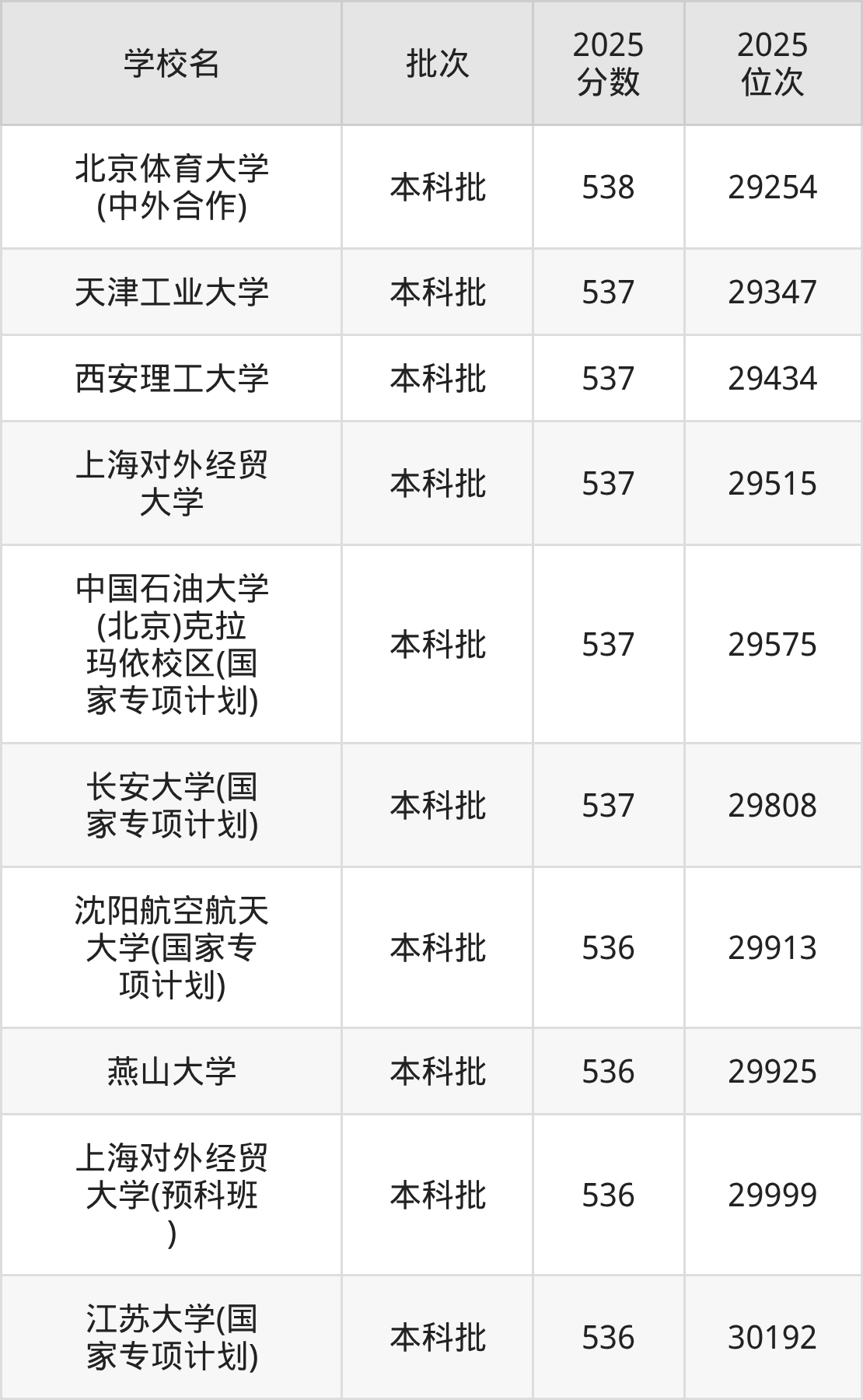 另外录取位次低于该区间(较稳妥)的有沈阳航空航天大学(国家专项计划)(29913名)、燕山大学(29925名)等;录取位次高于该区间(可冲)的有北京体育大学(中外合作)(29254名)、上海理工大学(28681名)等。