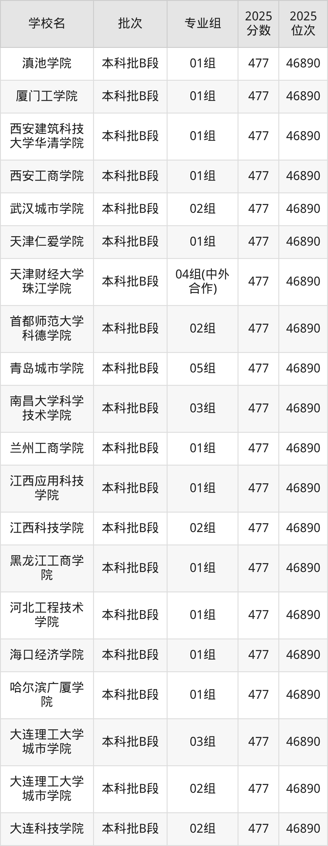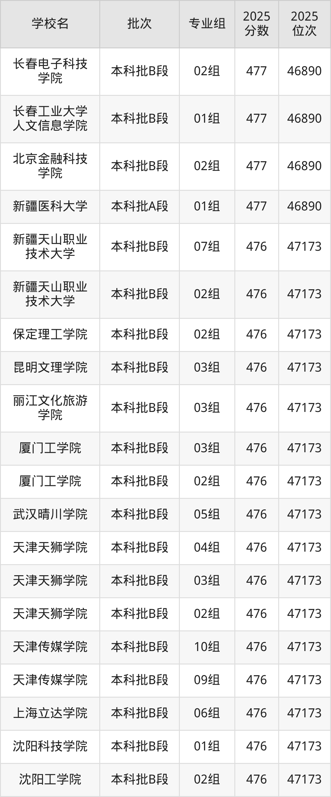 2025年天津高考477分(46614名~46890名)能上的大学有新疆医科大学01组、北京金融科技学院02组、长春工业大学人文信息学院01组、长春电子科技学院02组等。