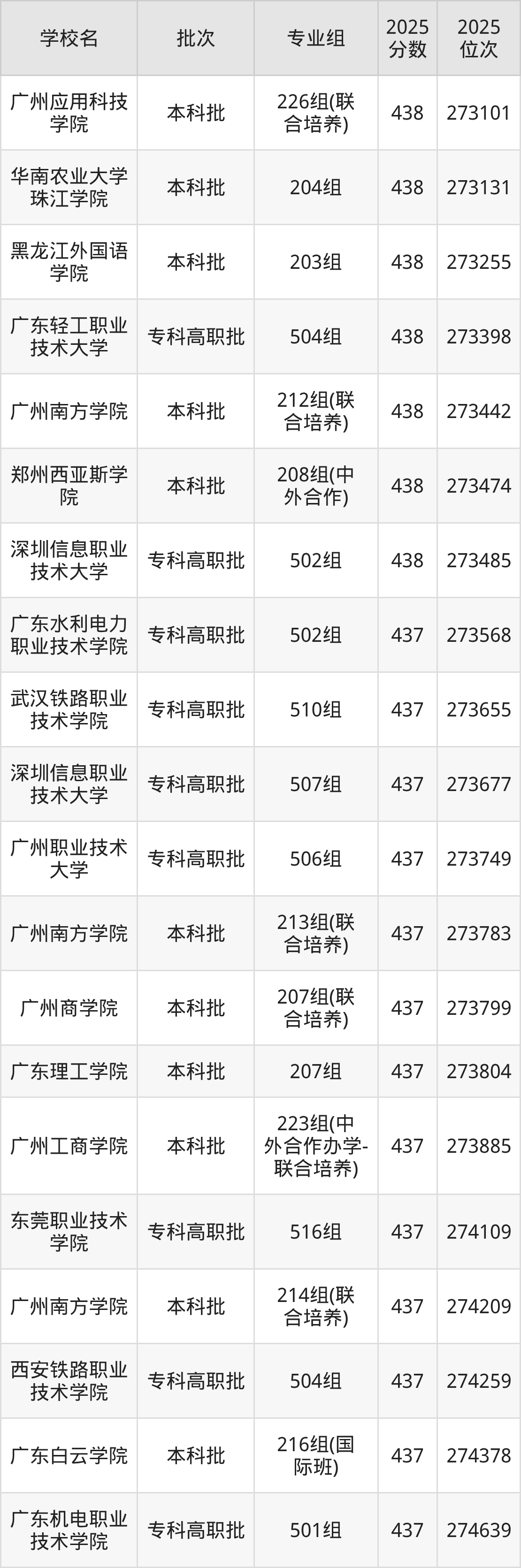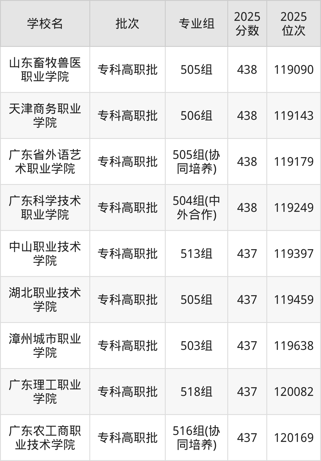 2025年广东高考历史类437分(119302名~120380名)能上的大学有湖北职业技术学院505组、广东农工商职业技术学院516组(协同培养)、广东理工职业学院518组、中山职业技术学院513组等。