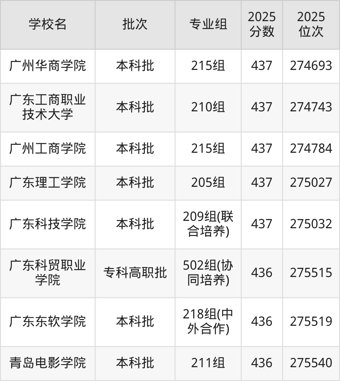 2025年广东高考物理类437分(273496名~275055名)能上的大学有广东白云学院216组(国际班)、广州南方学院213组(联合培养)、广州南方学院214组(联合培养)、广州华商学院215组等。