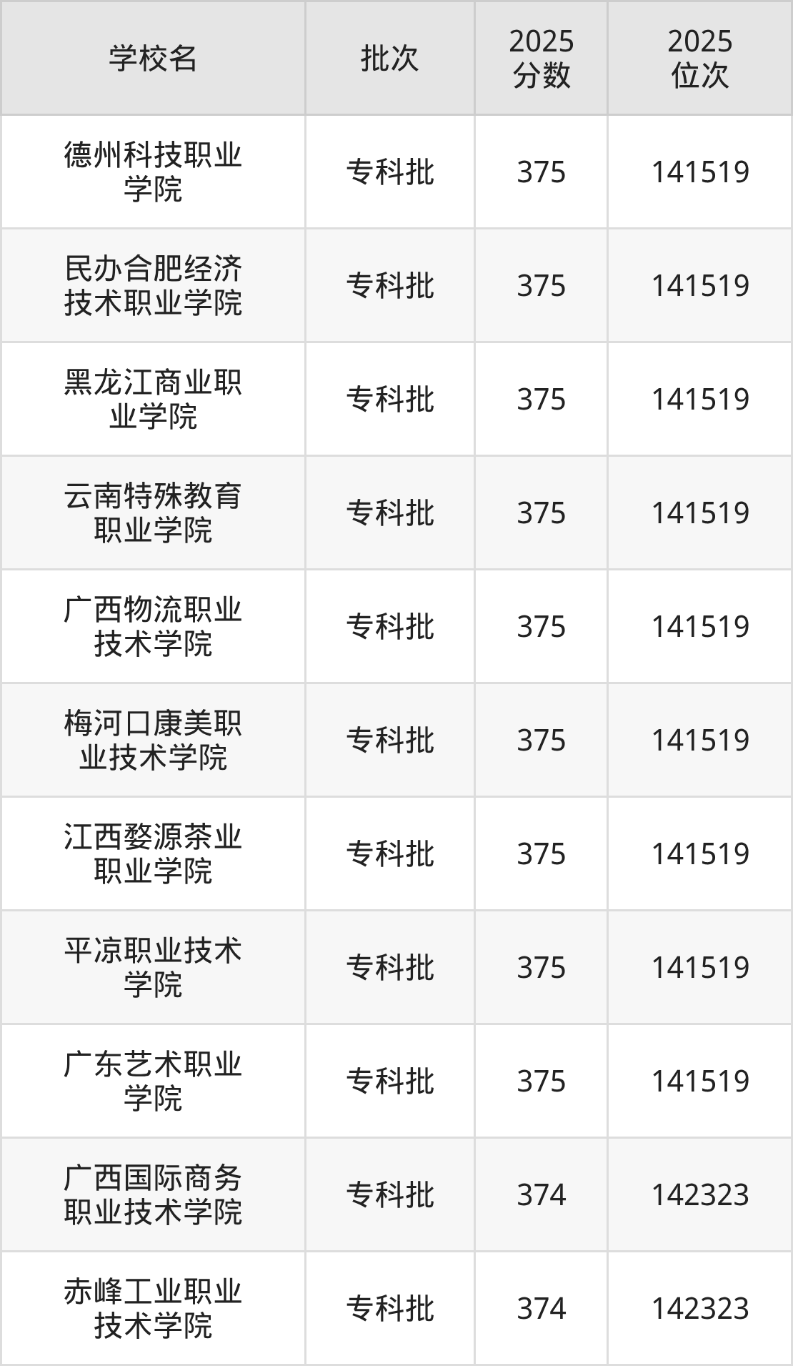 2025年河北高考历史类374分(141520名~142323名)能上的大学有赤峰工业职业技术学院、广西国际商务职业技术学院。