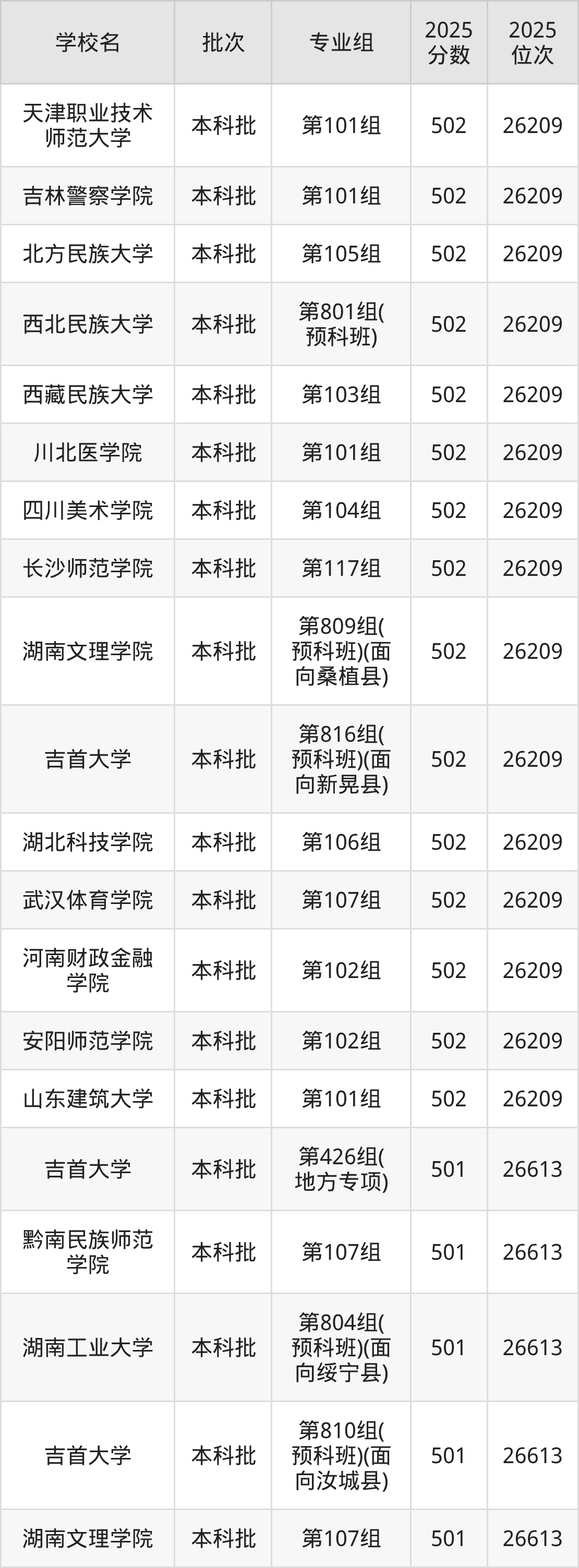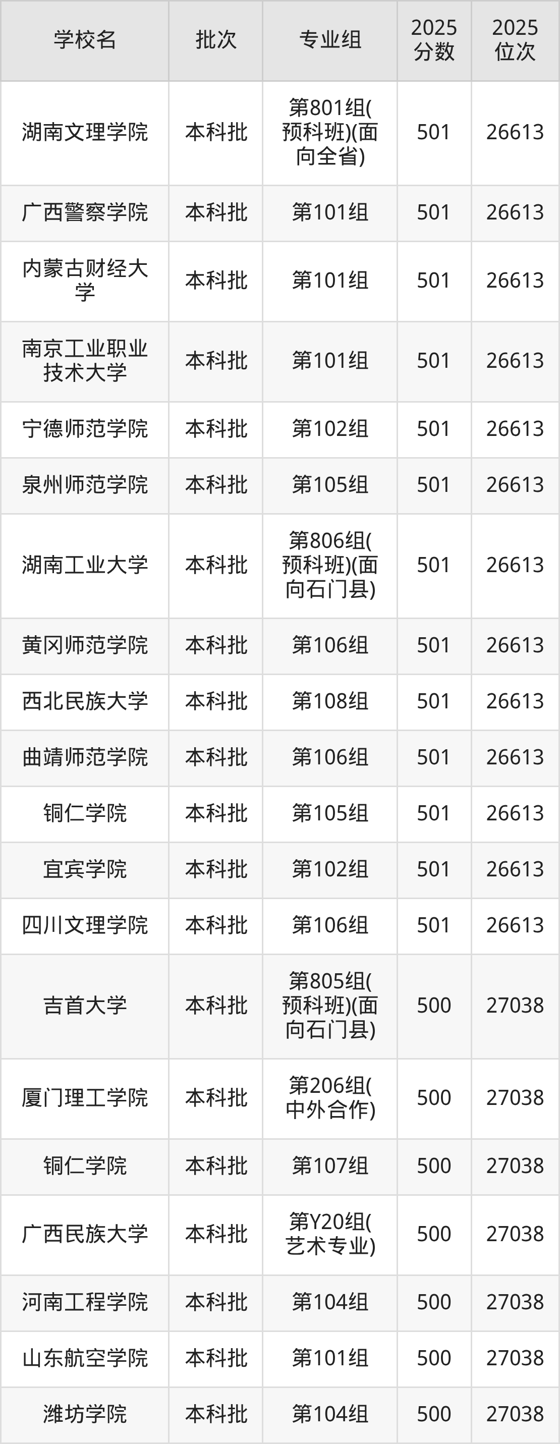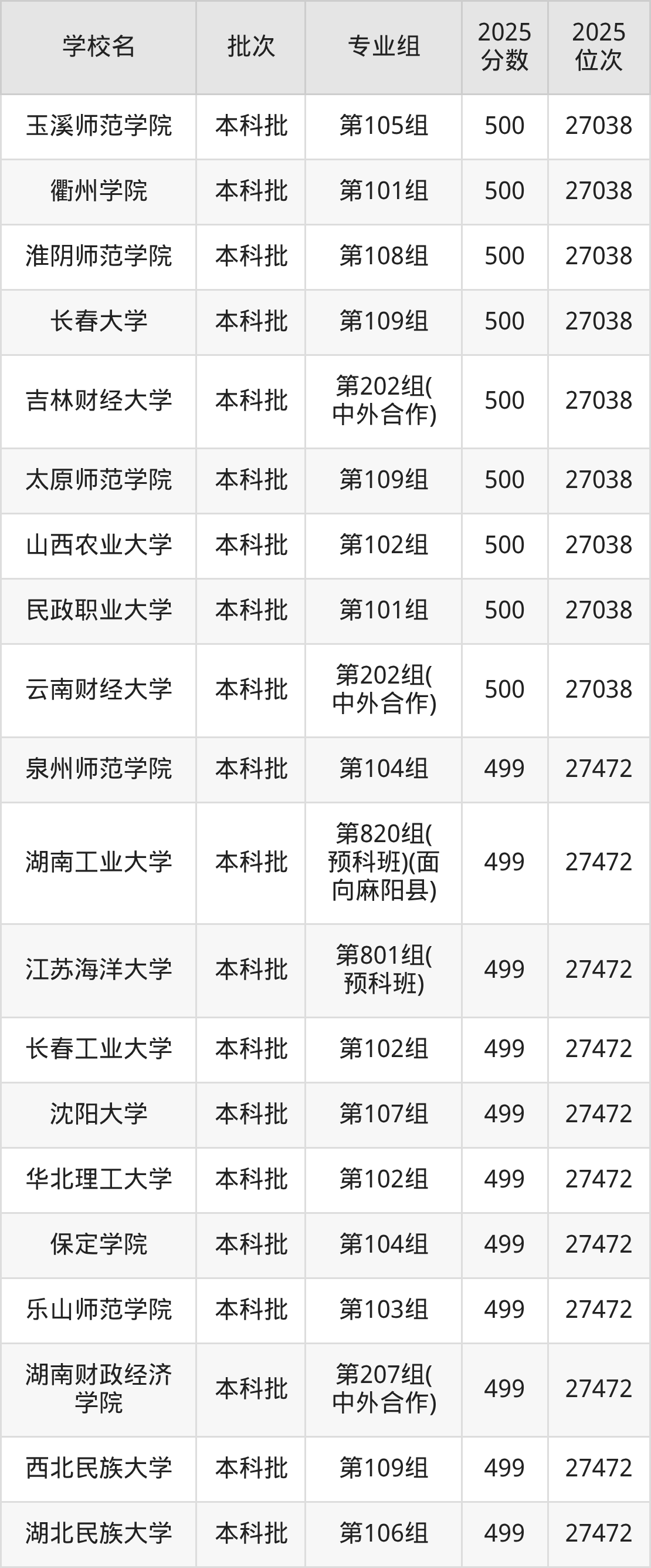 2025年湖南高考历史类500分(26614名~27038名)能上的大学有民政职业大学第101组、山西农业大学第102组、太原师范学院第109组、吉林财经大学第202组(中外合作)等。