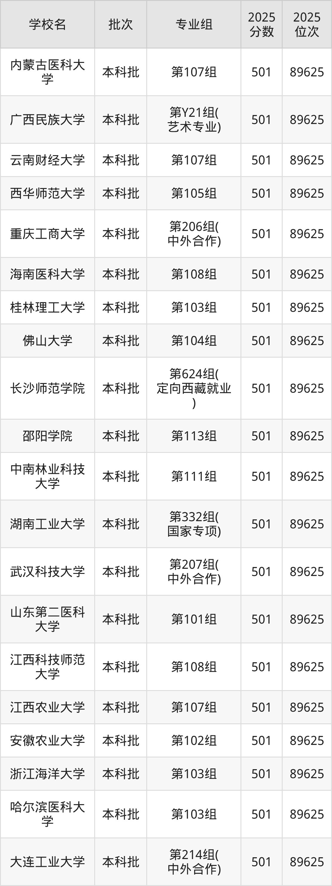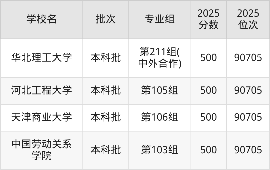 2025年湖南高考物理类500分(89626名~90705名)能上的大学有中国劳动关系学院第103组、天津商业大学第106组、河北工程大学第105组、华北理工大学第211组(中外合作)等。