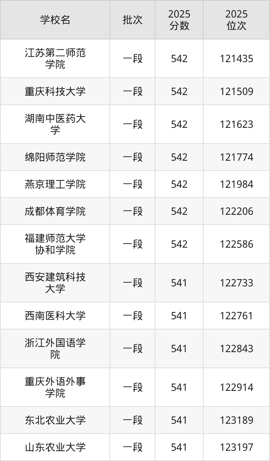 浙江高考542分:排名122712位。该分数位次对应能上的大学有福建师范大学协和学院、燕京理工学院、重庆科技大学、成都体育学院,更多名单如下文所示,2026届考生可参考。