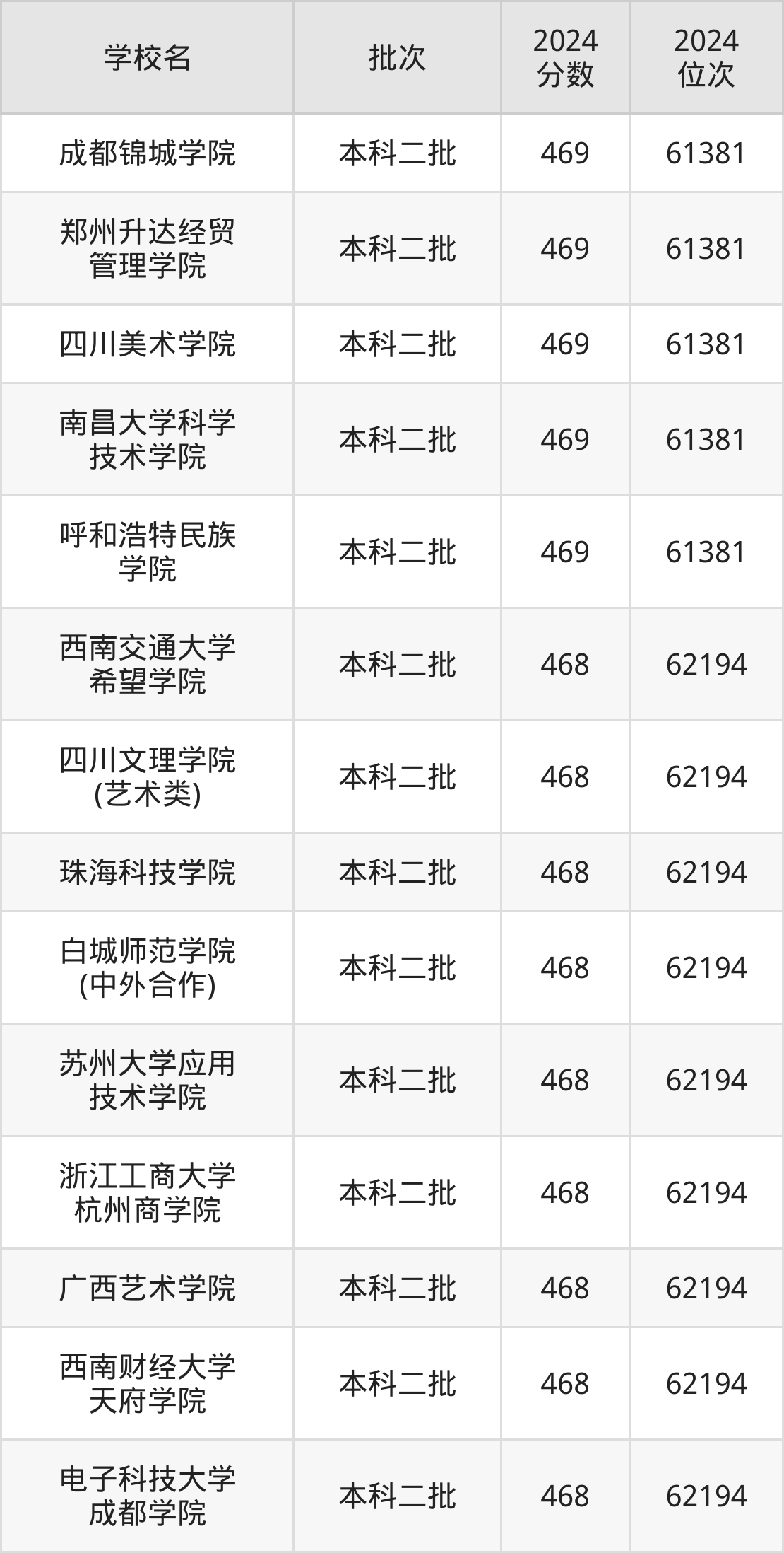 这些都是2025年高考文科61382名~62194名考生可以报考的大学,更多学校名单如下表所示: